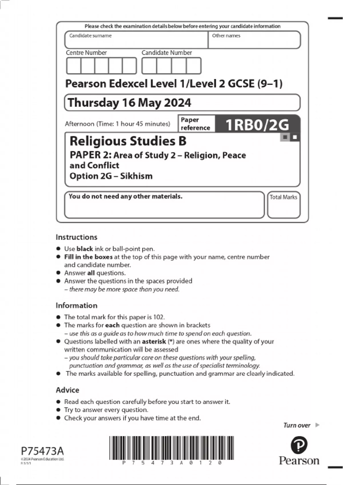 2024 Pearson Edexcel Level 1/Level 2 GCSE (9–1)Religious Studies B PAPER 2: Area of Study 2 – Religion, Peace and Conflict Option 2G – Sikhism QUESTION PAPER WITH FINAL MARKING SCHEME 100% VERIFIED