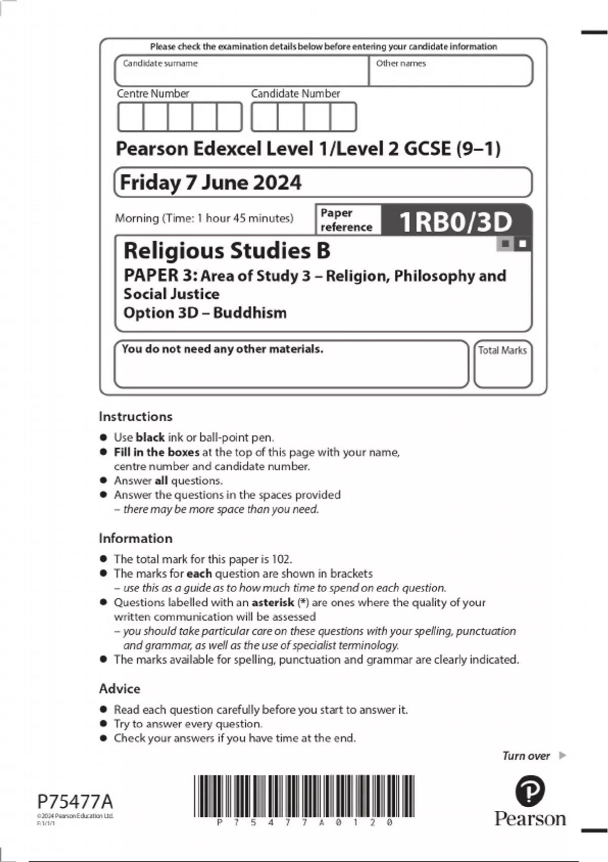 2024 Pearson Edexcel Level 1/Level 2 GCSE (9–1) Religious Studies PAPER 3: Area of Study 3 – Religion, Philosophy and Social Justice Option 3D – Buddhism QUESTION PAPER WITH FINAL MARKING SCHEME 100% VERIFIED