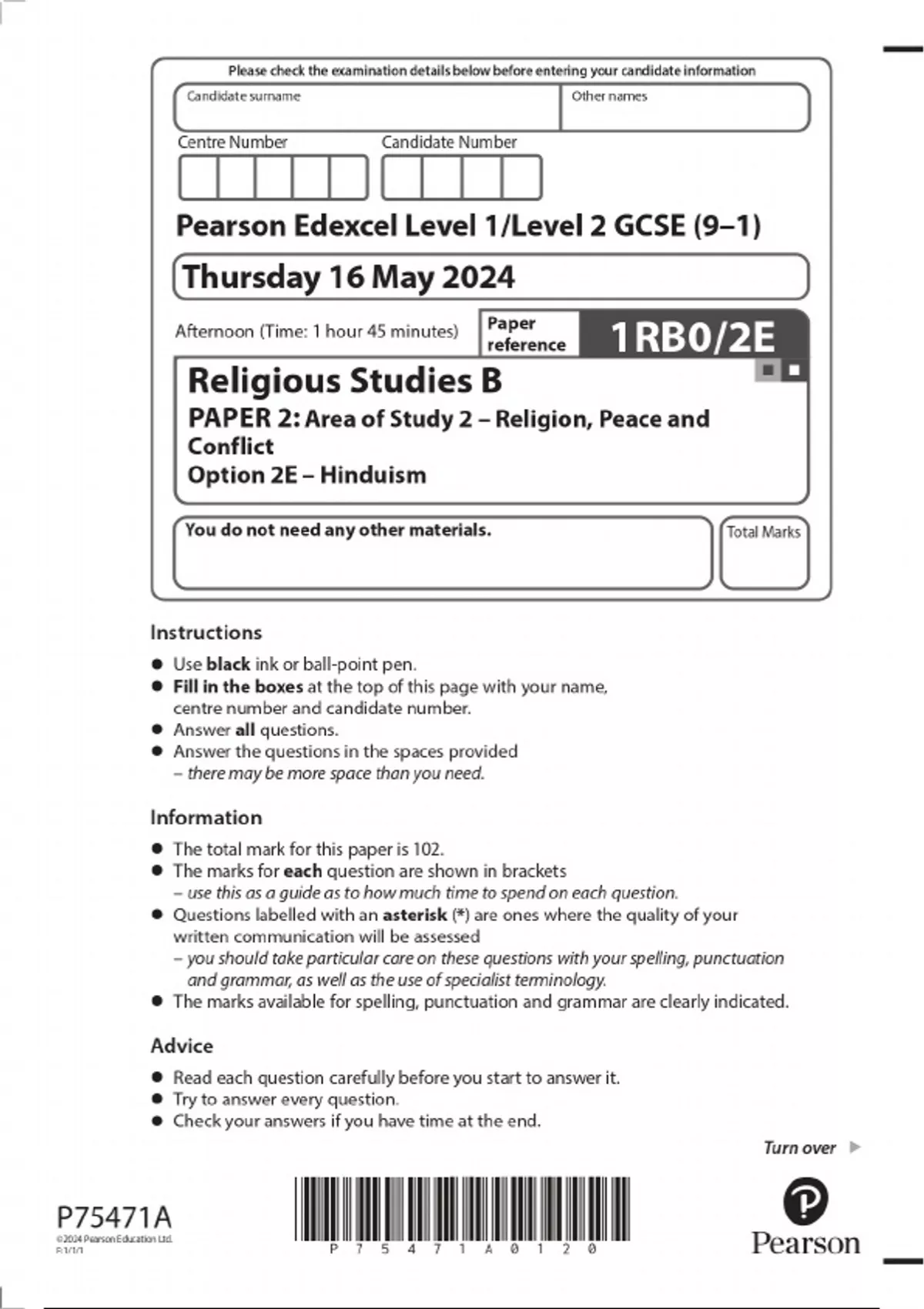 2024 Pearson Edexcel Level 1/Level 2 GCSE (9–1) Religious Studies B PAPER 2: Area of Study 2 – Religion, Peace and Conflict Option 2E – Hinduism QUESTION PAPER WITH FINAL MARKING SCHEME 100% VERIFIED