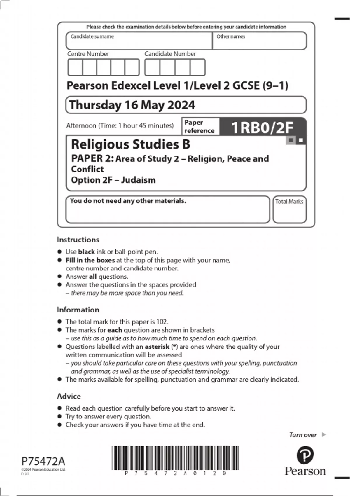 2024 Pearson Edexcel Level 1/Level 2 GCSE (9–1) Religious Studies B PAPER 2: Area of Study 2 – Religion, Peace and Conflict Option 2F – Judaism QUESTION PAPER WITH FINAL MARKING SCHEME 100% VERIFIED