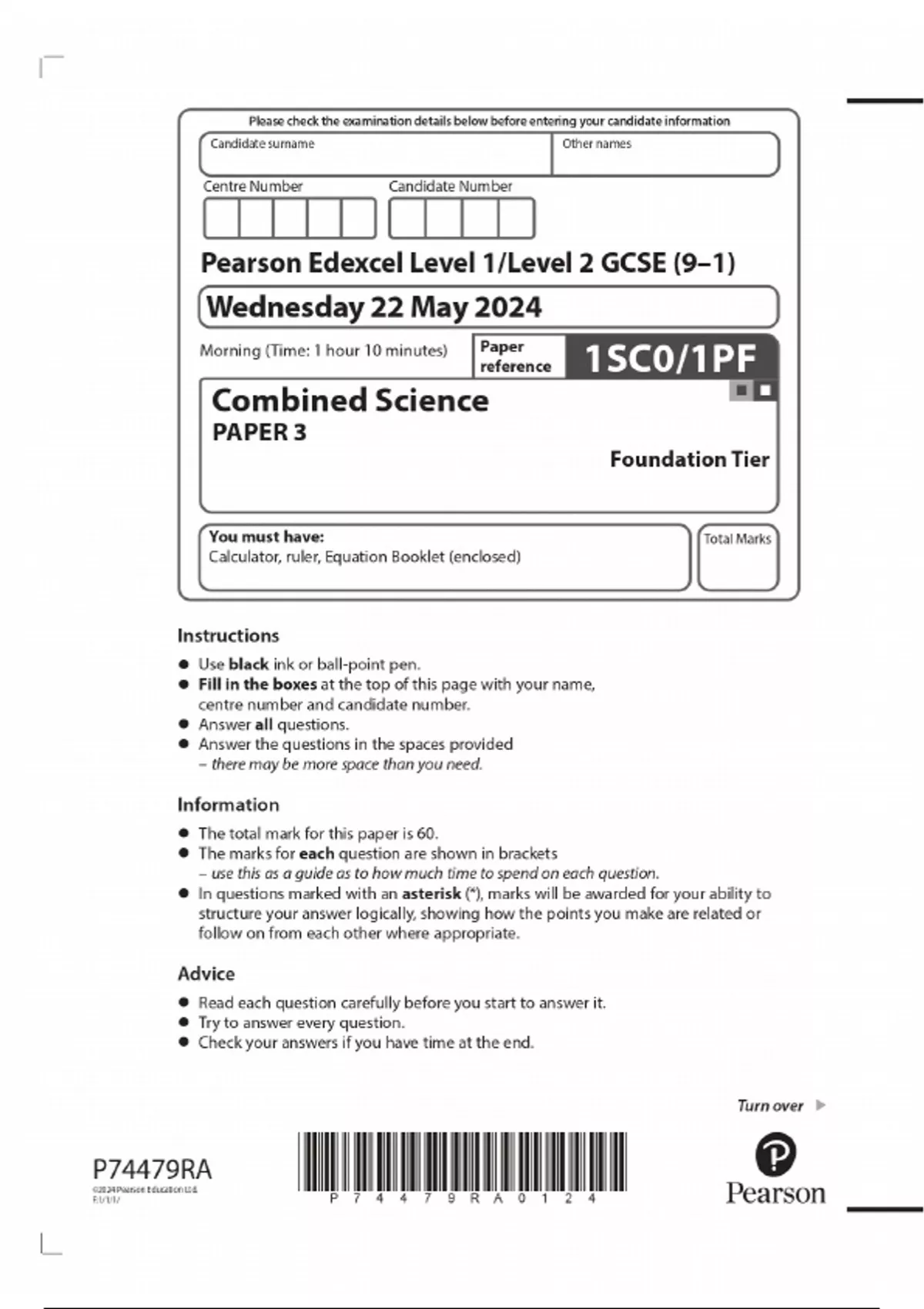 2024 Pearson Edexcel Level 1/Level 2 GCSE (9–1) Combined Science PAPER 3 Foundation Tier QUESTION PAPER WITH FINAL MARKING SCHEME 100% VERIFIED