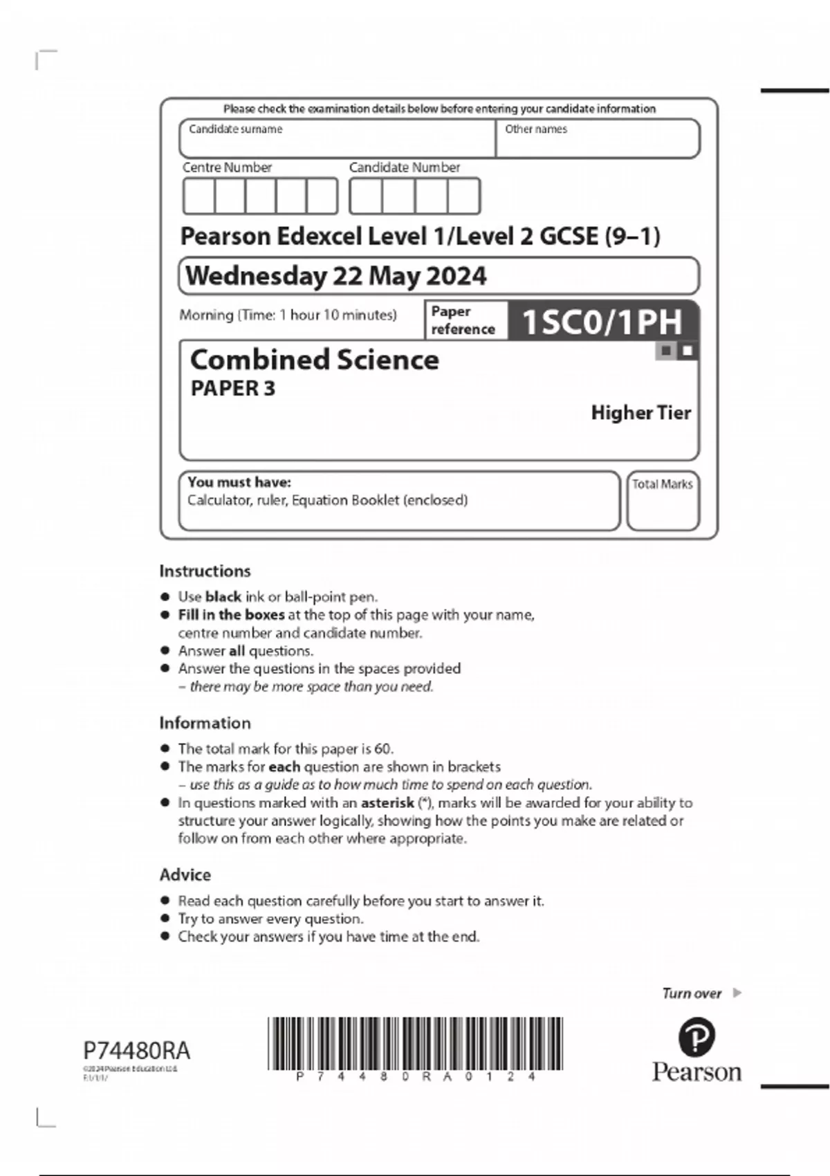 2024 Pearson Edexcel Level 1/Level 2 GCSE (9–1) Combined Science PAPER 3 Higher Tier QUESTION PAPER WITH FINAL MARKING SCHEME 100% VERIFIED
