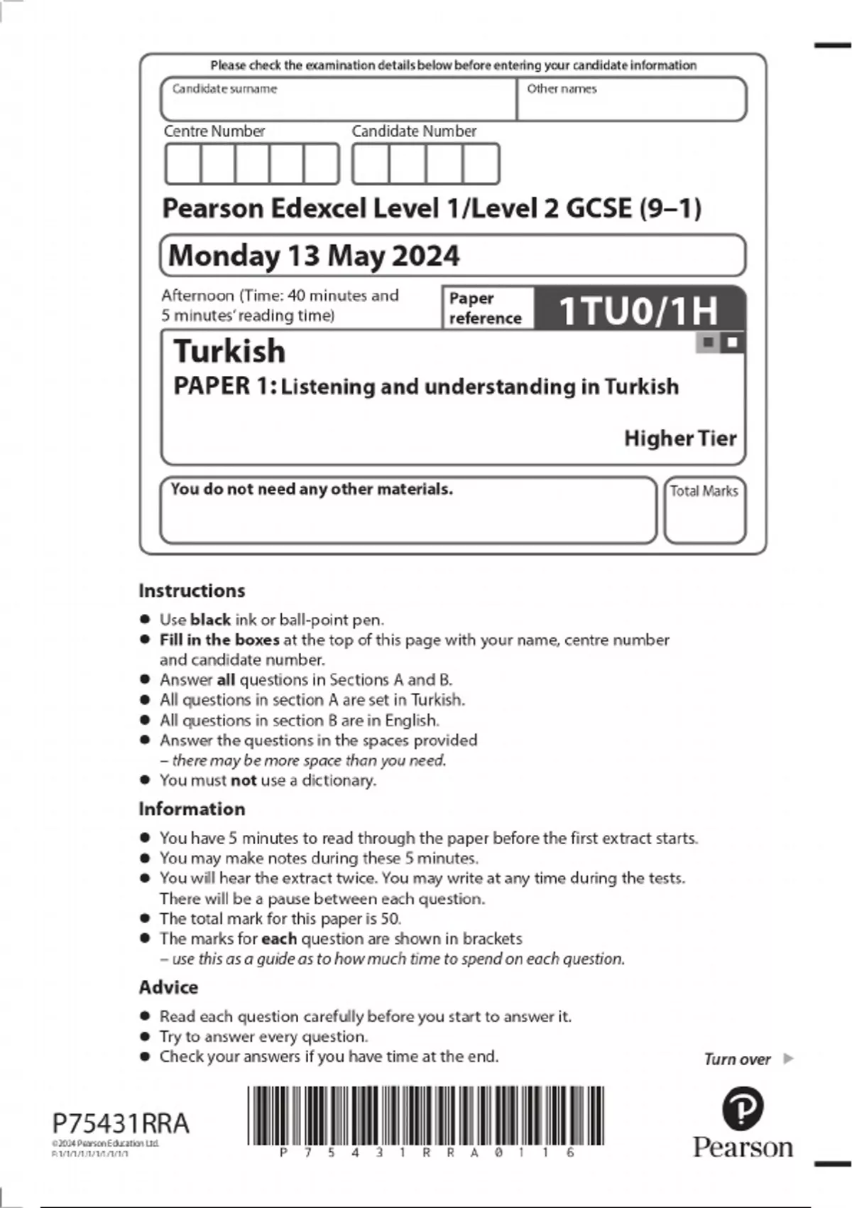 2024 Pearson Edexcel Level 1/Level 2 GCSE (9–1) Turkish PAPER 1: Listening and understanding in Turkish Higher Tier QUESTION PAPER WITH FINAL MARKING SCHEME 100% VERIFIED