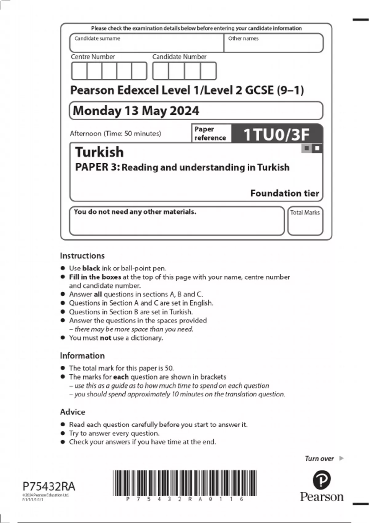 2024 Pearson Edexcel Level 1/Level 2 GCSE (9–1) Turkish PAPER 3: Reading and understanding in Turkish Foundation tier QUESTION PAPER WITH FINAL MARKING SCHEME 100% VERIFIED