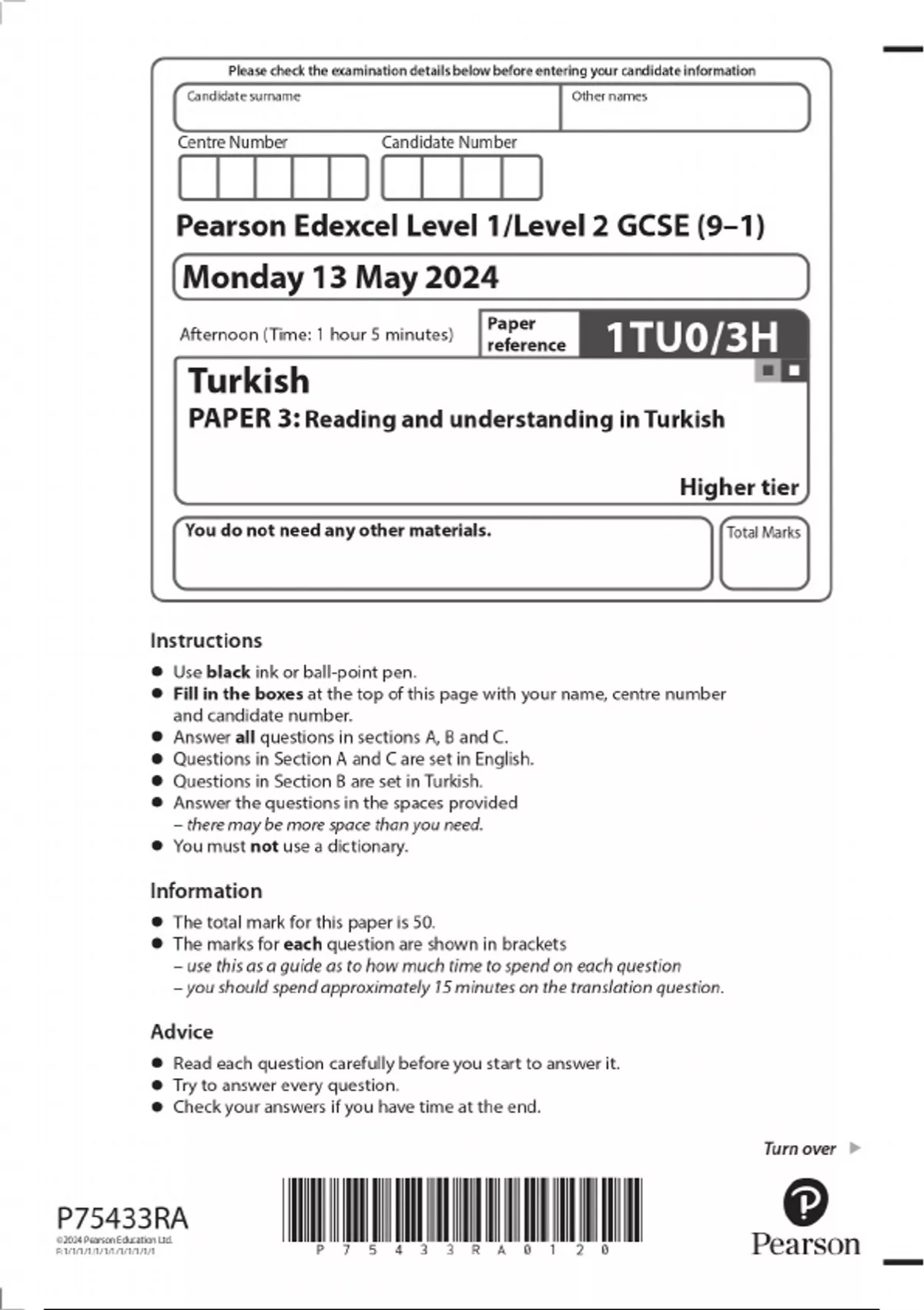 2024 Pearson Edexcel Level 1/Level 2 GCSE (9–1) Turkish PAPER 3: Reading and understanding in Turkish Higher tier QUESTION PAPER WITH FINAL MARKING SCHEME 100% VERIFIED