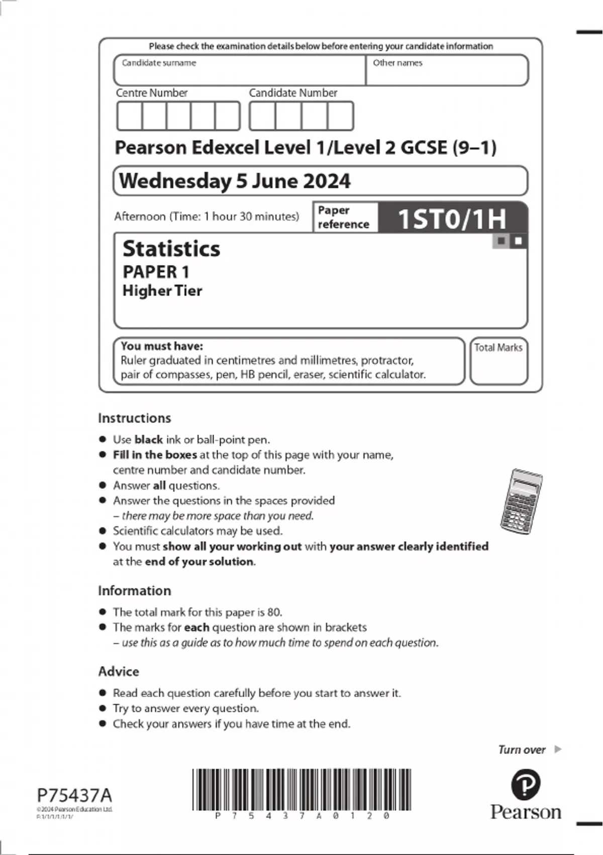 2024 Pearson Edexcel Level 1/Level 2 GCSE (9–1) Statistics PAPER 1 Higher Tier QUESTION PAPER WITH FINAL MARKING SCHEME 100% VERIFIED