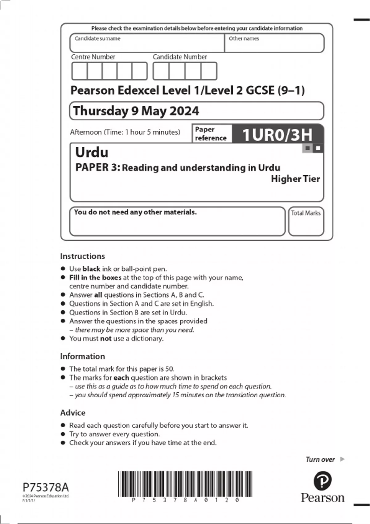 2024 Pearson Edexcel Level 1/Level 2 GCSE (9–1) Urdu PAPER 3: Reading and understanding in Urdu Higher Tier QUESTION PAPER WITH FINAL MARKING SCHEME 100% VERIFIED