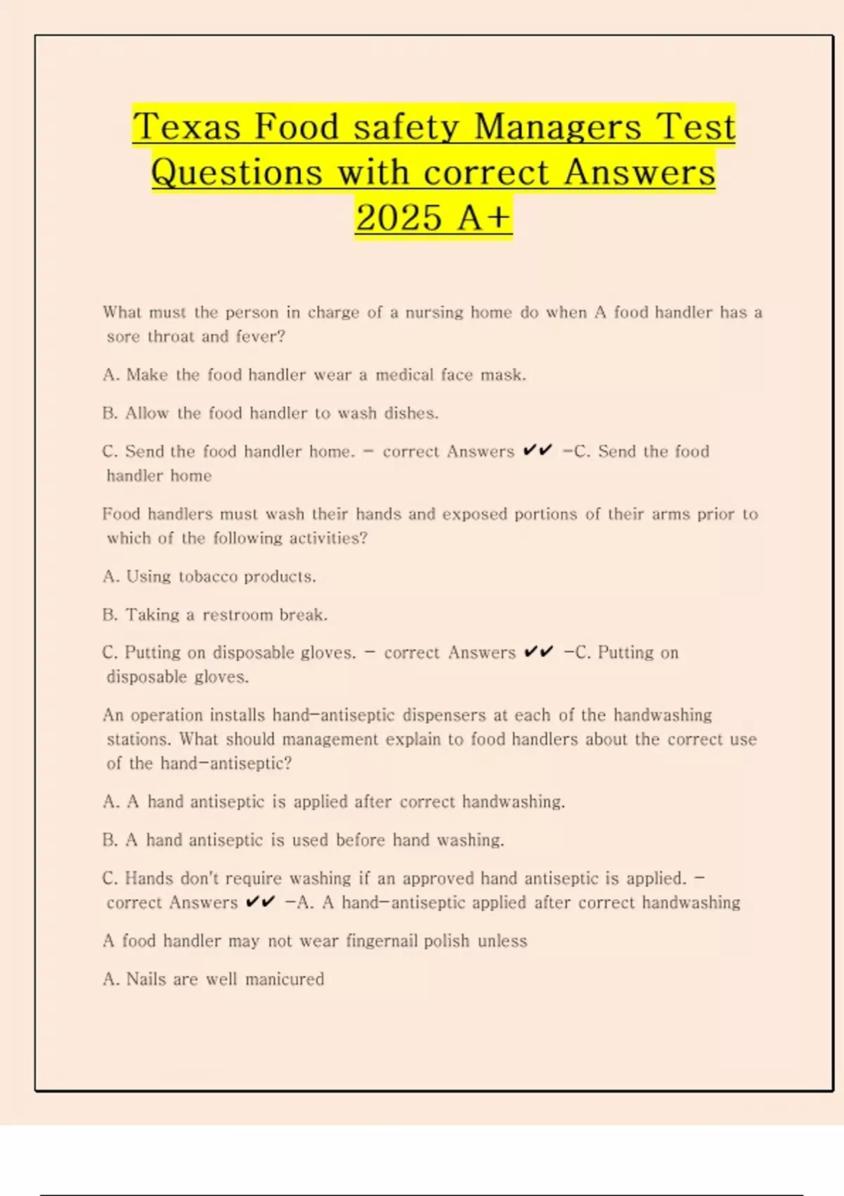 Texas Food safety Managers Test Questions with correct Answers 2025 A+