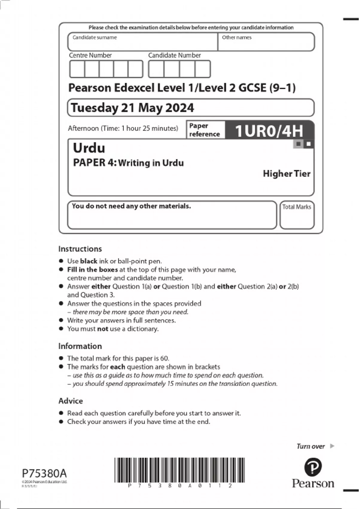 2024 Pearson Edexcel Level 1/Level 2 GCSE (9–1) Urdu PAPER 4: Writing in Urdu Higher Tier QUESTION PAPER WITH FINAL MARKING SCHEME 100% VERIFIED