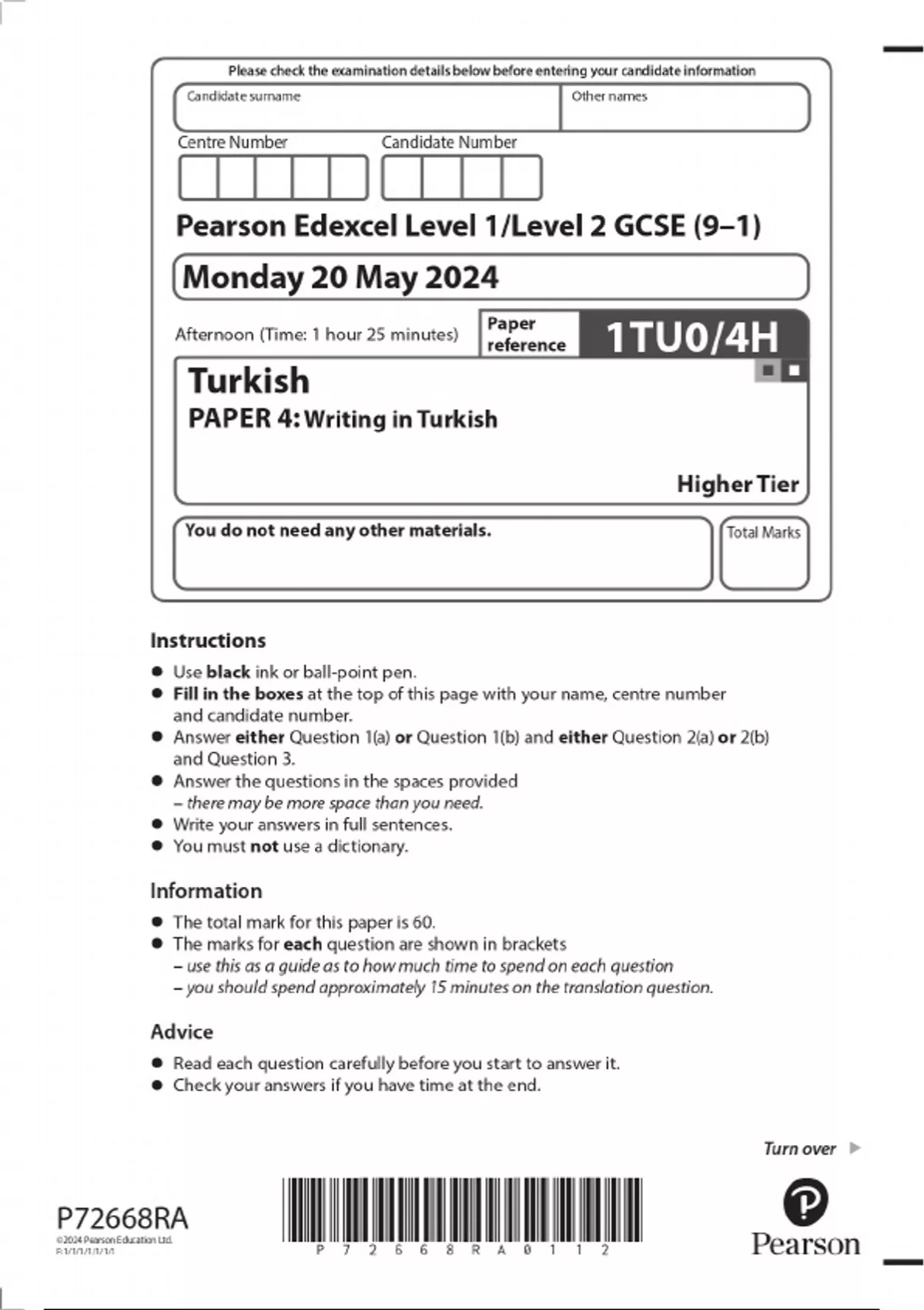 2024 Pearson Edexcel Level 1/Level 2 GCSE (9–1) Turkish PAPER 4: Writing in Turkish Higher Tier QUESTION PAPER WITH FINAL MARKING SCHEME 100% VERIFIED