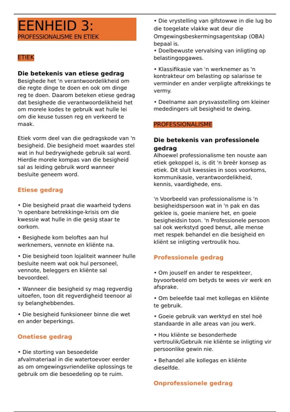 My studienotas is sorgvuldig opgestel om ’n duidelike en omvattende oorsig van die materiaal te bied. Elke onderwerp word in goed georganiseerde afdelings verdeel, wat dit maklik maak om te volg en te verstaan. Die notas is bondig maar deeglik, wat sleutelkonsepte in detail dek sonder om die leser oorweldig. Ek gebruik presiese taal en duidelike verduidelikings om te verseker dat die inhoud beide toeganklik en boeiend is. Goed navors en akkuraat, my notas bied waardevolle insigte en voorbeelde wat studente help om selfs die mees komplekse idees te begryp. Dit is ontwerp om so effektief as moontlik te wees, en is ’n noodsaaklike bron vir enigeen wat in hul studies wil slaag.