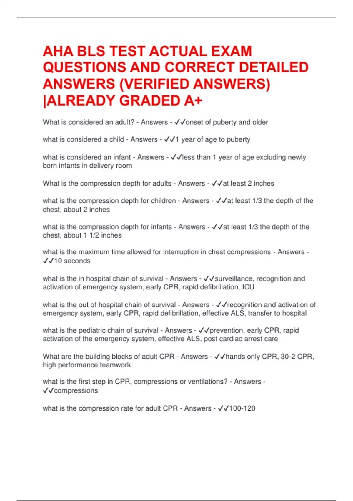 AHA BLS TEST ACTUAL EXAM QUESTIONS AND CORRECT DETAILED ANSWERS (VERIFIED ANSWERS) |ALREADY GRADED A+ What is considered an adult? - Answers - onset of puberty and older what is considered a child - Answers - 1 year of age to puberty what is considered an infant - Answers - less than 1 year of age excluding newly born infants in delivery room What is the compression depth for adults - Answers - at least 2 inches what is the compression depth for children - Answers - at least 1/3 the depth of the chest, about 2 inches what is the compression depth for infants - Answers - at least 1/3 the depth of the chest, about 1 1/2 inches what is the maximum time allowed for interruption in chest compressions - Answers - 10 seconds what is the in hospital chain of survival - Answers - surveillance, recognition and activation of emergency system, early CPR, rapid defibrillation, ICU what is the out of hospital chain of survival - Answers - recognition and activation of emergency system, early CPR, rapid defibrillation, effective ALS, transfer to hospital what is the pediatric chain of survival - Answers - prevention, early CPR, rapid activation of the emergency system, effective ALS, post cardiac arrest care What are the building blocks of adult CPR - Answers - hands only CPR, 30-2 CPR, high performance teamwork what is the first step in CPR, compressions or ventilations? - Answers - compressions what is the compression rate for adult CPR - Answers - 100-120