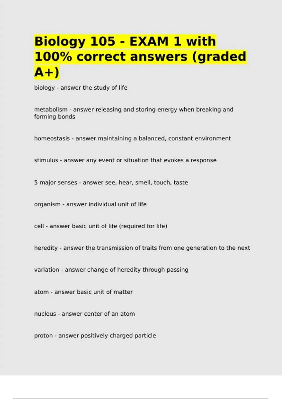Biology 105 - EXAM 1 with 100- correct answers (graded A+).