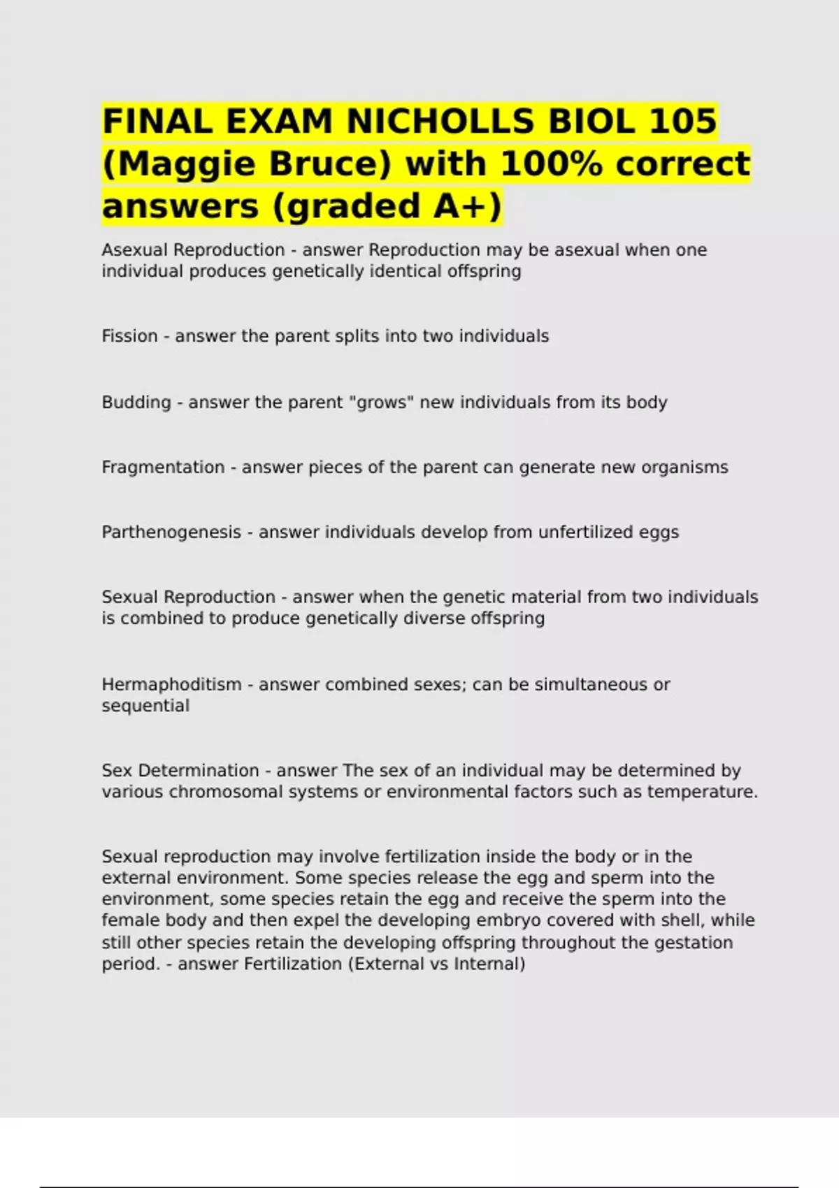 FINAL EXAM NICHOLLS BIOL 105 (Maggie Bruce) with 100- correct answers (graded A+).