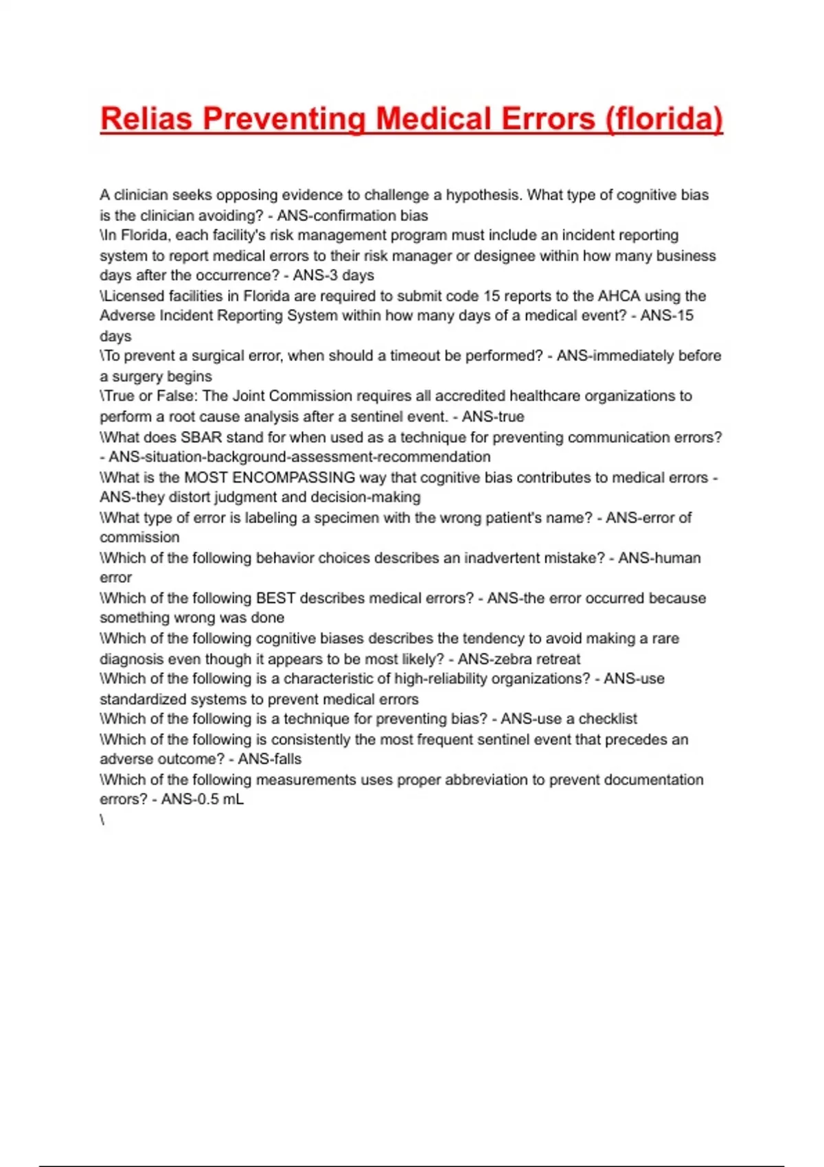 Relias Preventing Medical Errors (florida)