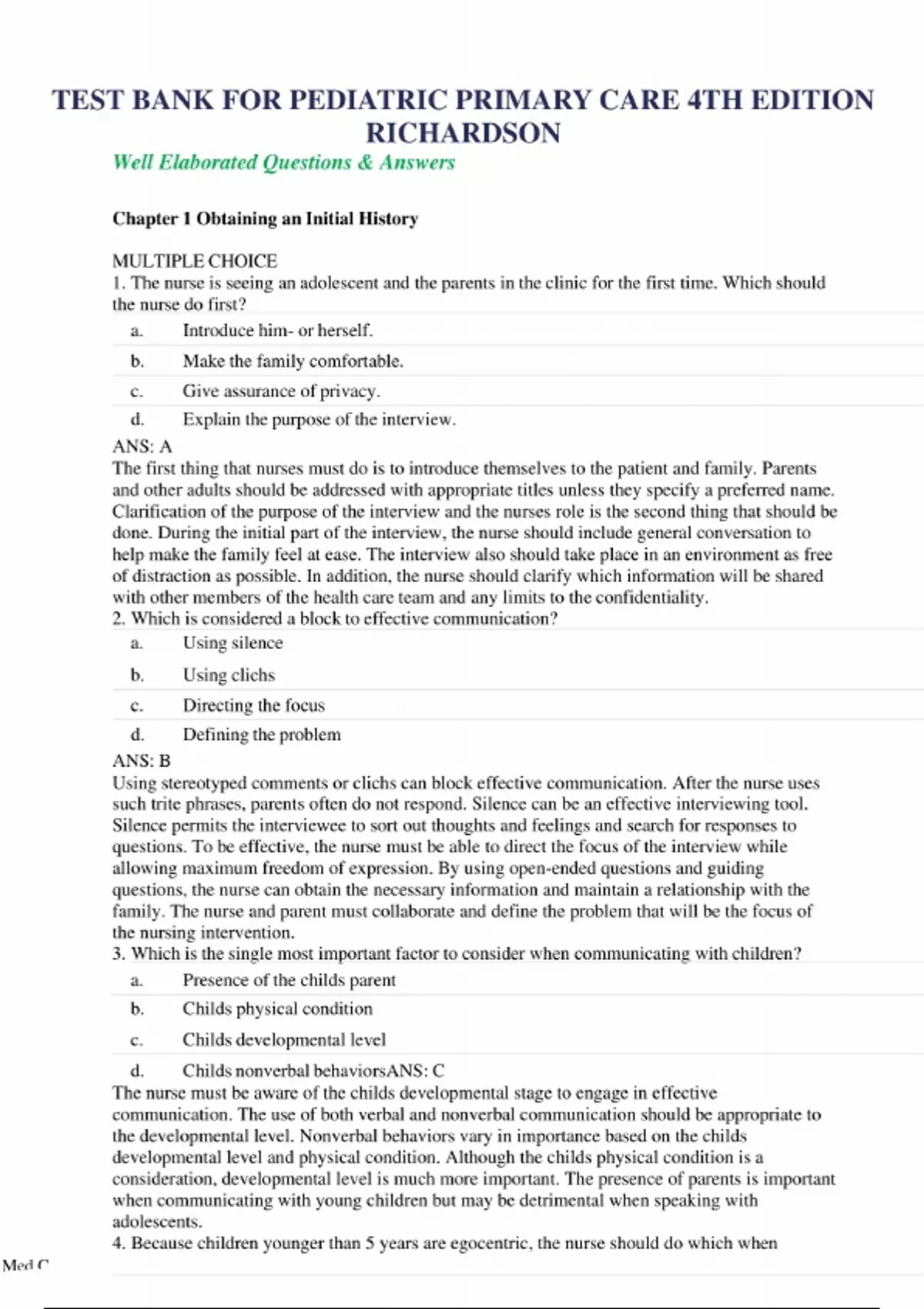 TEST BANK FOR PEDIATRIC PRIMARY CARE 4TH EDITION RICHARDSON ALL CHAPTERS ||GRADED A+ ||VERIFIED ANSWERS