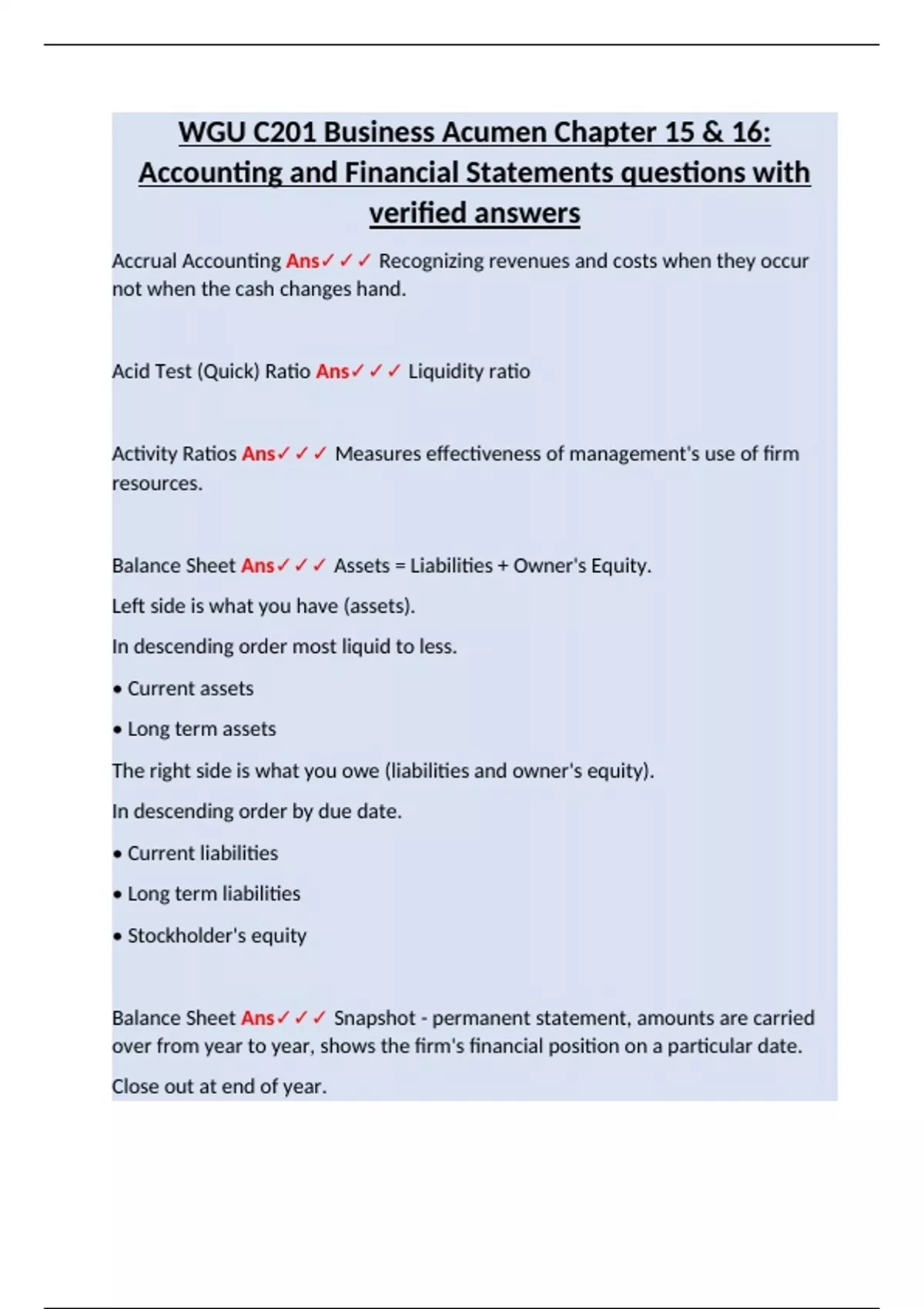 Balance Sheet Ans✓✓✓ Assets = Liabilities + Owner's Equity.