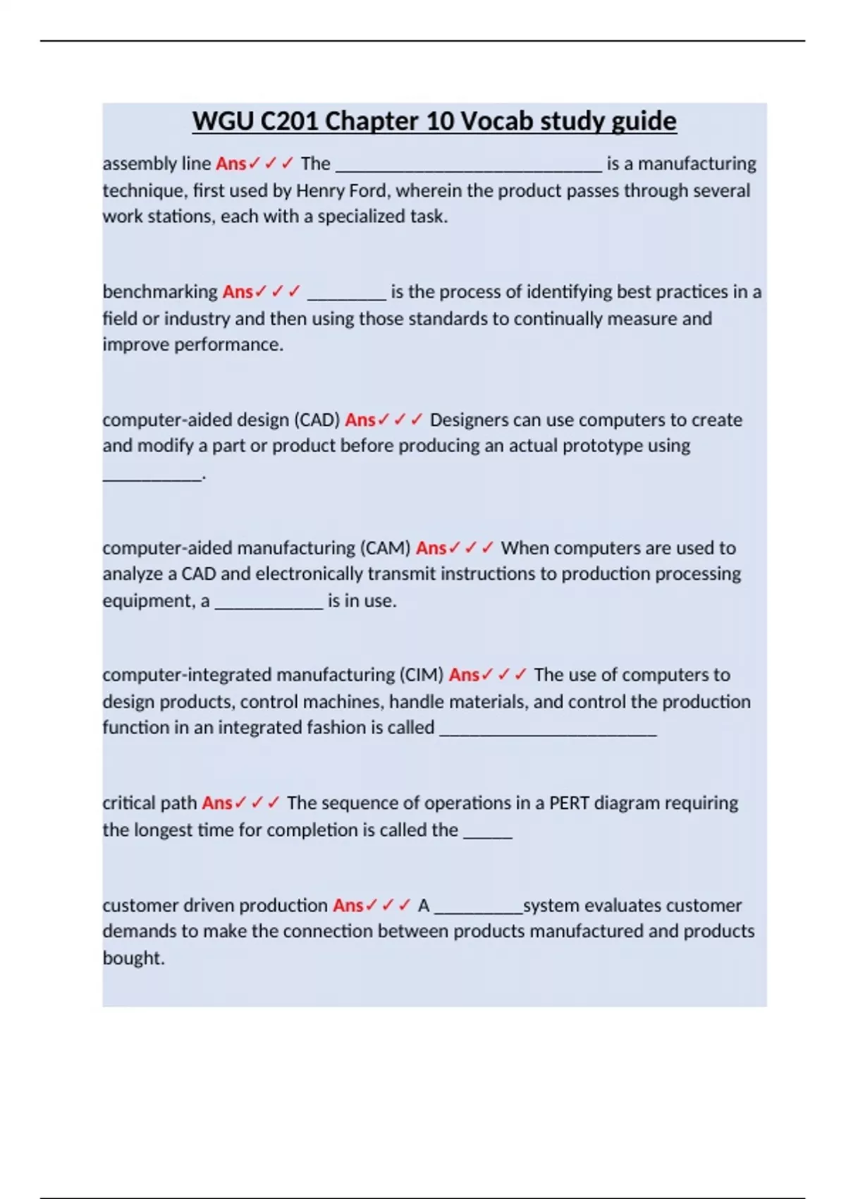 assembly line Ans The ___________________________ is a manufacturing technique, first used by Henry Ford, wherein the product passes through several work stations, each with a specialized task. benchmarking Ans ________ is the process of identifying best practices in a field or industry and then using those standards to continually measure and improve performance. computer-aided design (CAD) Ans Designers can use computers to create and modify a part or product before producing an actual prototype using __________. computer-aided manufacturing (CAM) Ans When computers are used to analyze a CAD and electronically transmit instructions to production processing equipment, a ___________ is in use. computer-integrated manufacturing (CIM) Ans The use of computers to design products, control machines, handle materials, and control the production function in an integrated fashion is called ______________________ critical path Ans The sequence of operations in a PERT diagram requiring the longest time for completion is called the _____ customer driven production Ans A _________system evaluates customer demands to make the connection between products manufactured and products bought.
