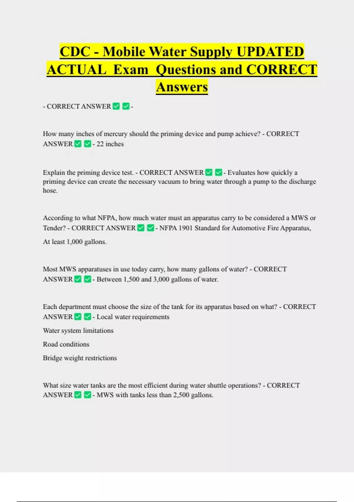 CDC - Mobile Water Supply UPDATED ACTUAL Exam Questions and CORRECT Answers