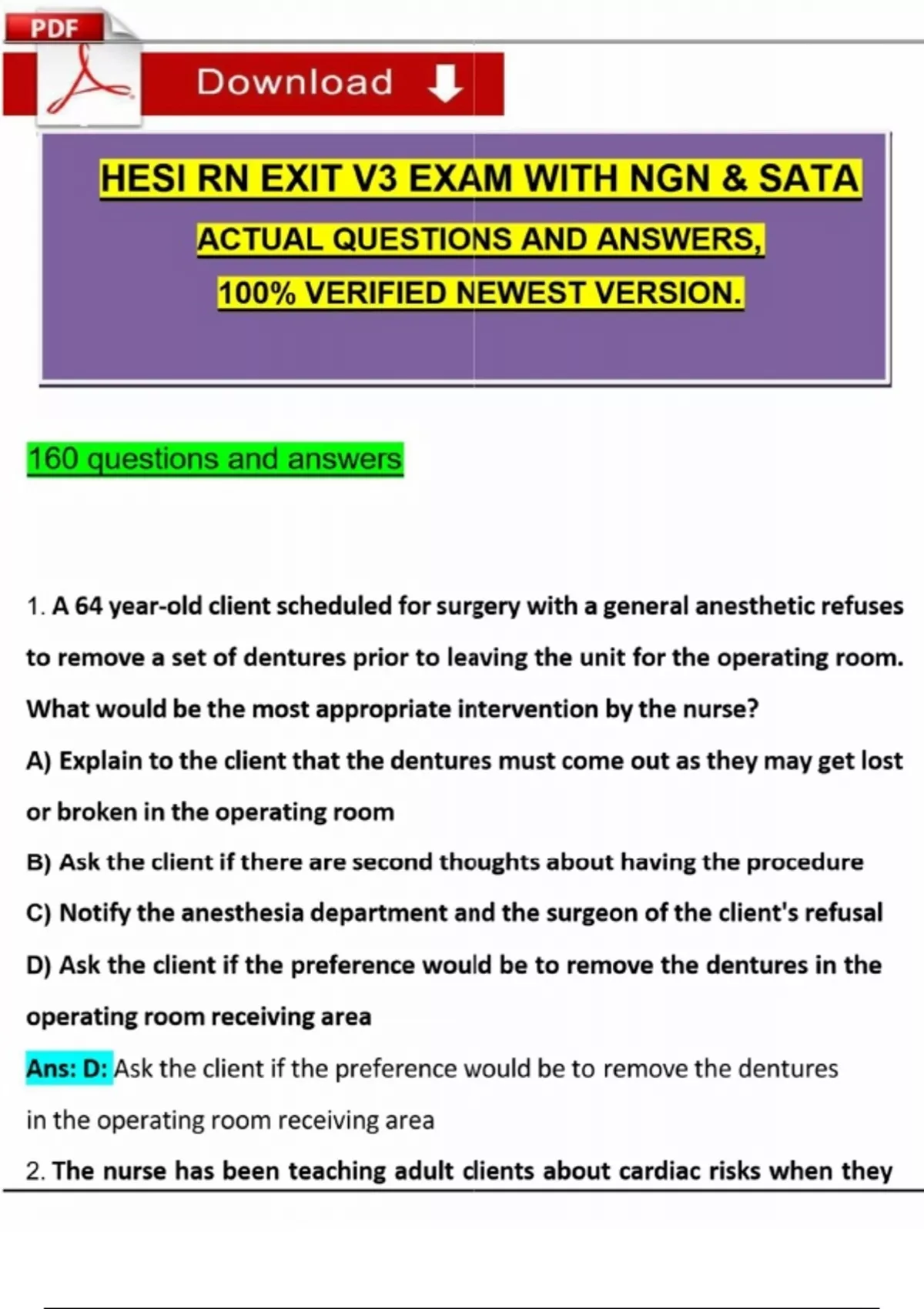 HESI RN EXIT V3 EXAM WITH NGN & SATA ACTUAL QUESTIONS AND ANSWERS. HESI RN EXIT V3 EXAM WITH NGN & SATA ACTUAL QUESTIONS AND ANSWERS.
