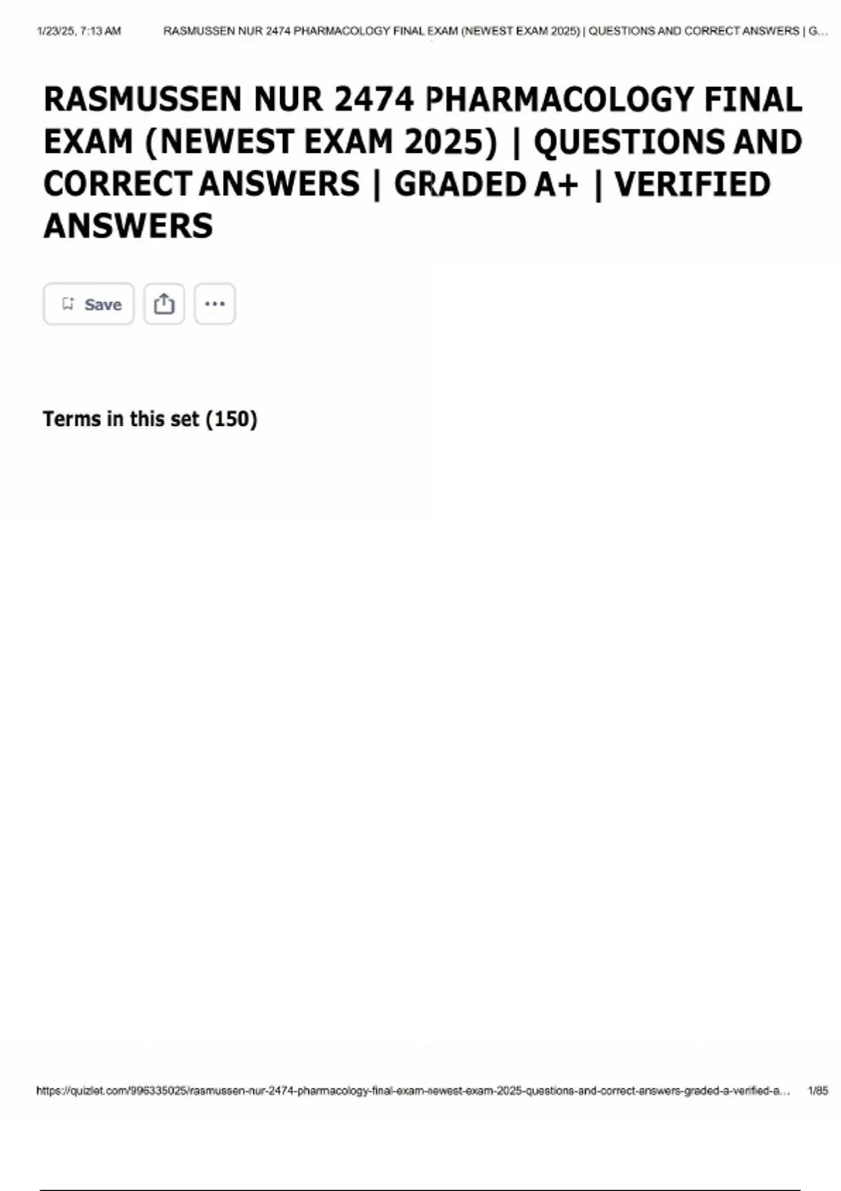 RASMUSSEN NUR 2474 PHARMACOLOGY FINAL EXAM (NEWEST EXAM 2025) LATEST UPDATE!!!! RASMUSSEN NUR 2474 PHARMACOLOGY FINAL EXAM (NEWEST EXAM 2025) LATEST UPDATE!!!!
