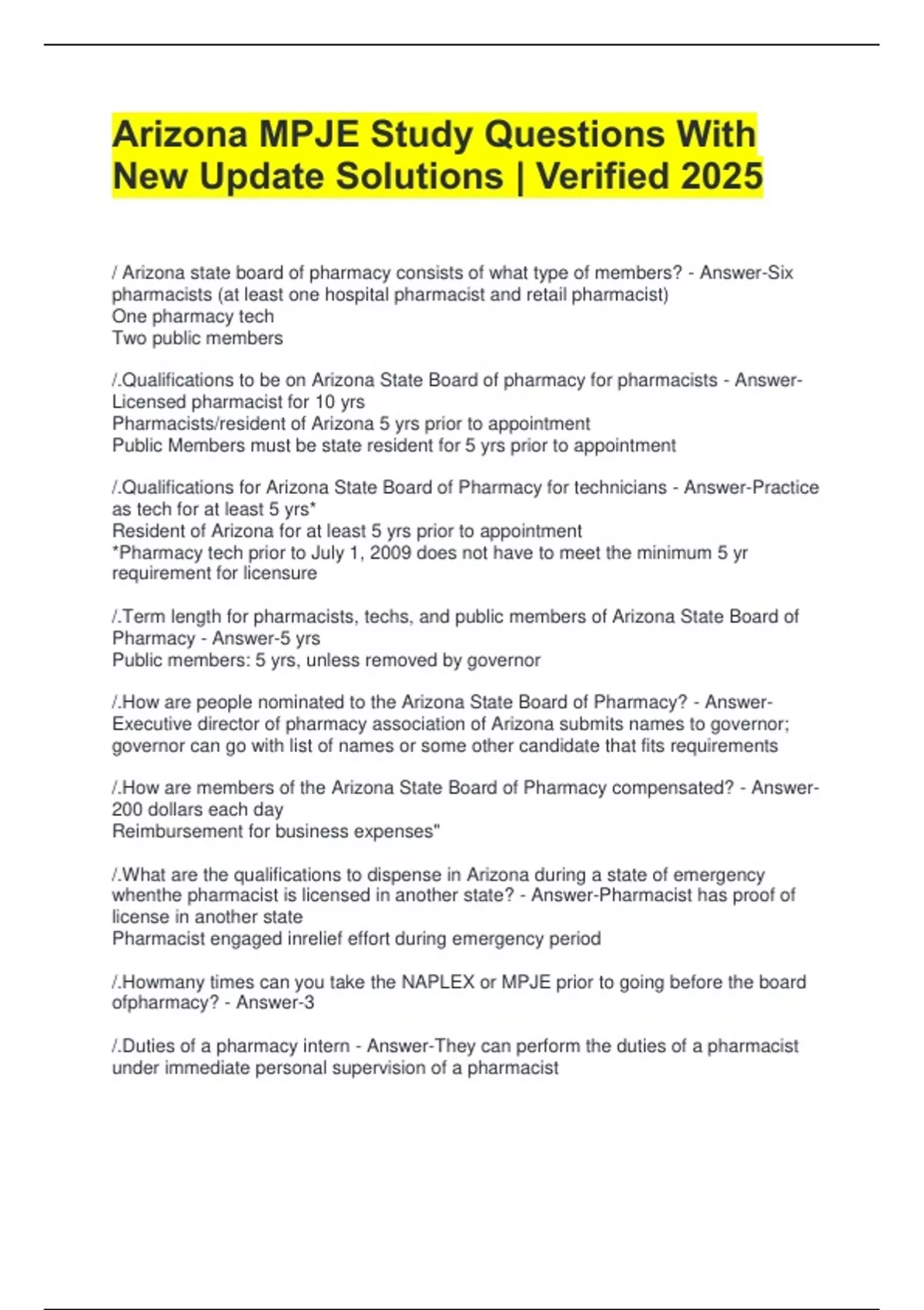 Arizona MPJE Study Questions With New Update Solutions | Verified 2025 / Arizona state board of pharmacy consists of what type of members? - Answer-Six pharmacists (at least one hospital pharmacist and retail pharmacist) One pharmacy tech Two public members /.Qualifications to be on Arizona State Board of pharmacy for pharmacists - Answer-Licensed pharmacist for 10 yrs Pharmacists/resident of Arizona 5 yrs prior to appointment Public Members must be state resident for 5 yrs prior to appointment /.Qualifications for Arizona State Board of Pharmacy for technicians - Answer-Practice as tech for at least 5 yrs* Resident of Arizona for at least 5 yrs prior to appointment *Pharmacy tech prior to July 1, 2009 does not have to meet the minimum 5 yr requirement for licensure /.Term length for pharmacists, techs, and public members of Arizona State Board of Pharmacy - Answer-5 yrs Public members: 5 yrs, unless removed by governor /.How are people nominated to the Arizona State Board of Pharmacy? - Answer-Executive director of pharmacy association of Arizona submits names to governor; governor can go with list of names or some other candidate that fits requirements /.How are members of the Arizona State Board of Pharmacy compensated? - Answer-200 dollars each day Reimbursement for business expenses" /.What are the qualifications to dispense in Arizona during a state of emergency whenthe pharmacist is licensed in another state? - Answer-Pharmacist has proof of license in another state Pharmacist engaged inrelief effort during emergency period /.Howmany times can you take the NAPLEX or MPJE prior to going before the board ofpharmacy? - Answer-3 /.Duties of a pharmacy intern - Answer-They can perform the duties of a pharmacist under immediate personal supervision of a pharmacist /.How long can a person be a pharmacy intern? - Answer-6 years Must provide explanation to the board as to why you need longer /.Pharmacy technician license qualifications - Answer-Good moral character At least 18 yrs oldHigh school diploma or equivalent Completed training programPass pharmacy tech exam /.Renewal period for pharmacists and technicians - Answer-License ends in odd number: Biennially on November 1 of odd numbered years License ends in evennumber: Biennially on November 1 of even numbered years" /.How many days in advance can you apply for license renewal - Answer-Not more than 60 days /.What must be done for a pharmacist that has not had active license for 5 consecutiveyears? - Answer-Proof of fitness to be licensed Payment of all pastdue fees and penalties /.Biennialrenewal fees for pharmacists, tech, and duplicate renewal license - Answer-Pharmacists: 250 Technicians: 100 Duplicate: 25 /.How many days do you have to alert the executive director of a new home address oremployer address - Answer-Within 10 business days /.What is the notification period for a PIC when the start or terminate in thatposition? - Answer-Immediately to the executive director /.Who is responsible to notify the board of pharmacy when a pharmacists or intern isterminated because professionally incompetent, unprofessional conduct,mentally/physically incompetent? - Answer-PIC Must submit general statement of the reasons that lead to termination /.What can the board do after investigating a situation where there is not sufficient seriousness to merit disciplinary action? - Answer-"Dismiss the complaint without merit File an advisory letter. Licenseecan file written response within 30 days Require licensee to completed board designated CE courses" /.Whatis the maximum civil penalty for violation of the pharmacy chapter? - Answer-$1,000 /.How often does a pharmacy, wholesaler/manufacturer, or another other place that sells drugs, compounds, dispenses, stocks, exposes, manufactures, or offers for sale? - Answer-Biennial registration /.What are the classes of permits Arizona can give in regards to pharmacies and places that sell drugs? - Answer-Nonprescription drug permit Limited service pharmacy, full service wholesale drug, nonprescription wholesale, and drug manufacturing permit Drug packager or repackager Compressed medical gas distributor /.What to do with license if pharmacy closes down - Answer-Surrender license to executive directorRemove all drug signs and symbols Destroy all drugs, devices, and poisonous or hazardous substances" /.What is the schedule to renew a license for a pharmacy? - Answer-Every two years Odd numbered license: on odd years Even numbered license: on even years /.Rules regarding the display of license or permit in pharmacy - Answer-Must be displayed visually in pharmacy Must be current license /.What are the rules regarding supervision by a pharmacist in a hospital with more than 50 beds? - Answer-Must be continually under supervision of a pharmacist during operating hoursBoard may make exceptions to pharmacists engaged in hospital business outside of pharmacy /.What are the rules regarding supervisor of a pharmacists in a hospital with less than 50 beds? - Answer-Services of pharmacist required on a part-time basis Approval of this does not permit compounding, manufacturing, dispensing, labeling, packaging or processing of drugs by other than a pharmacist /.Who can obtain drugs in the absence of a pharmacist in a hospital? - Answer-Supervisory registered nurse Must be ordered by medical practitioner Emergencies only Procedure must be approved by hospital /.Who can compound, sell, or dispense compounded drugs? - Answer-Pharmacist/Pharmacy intern under the direction of a pharmacist Techs can dispense only if under the direction supervision of a pharmacist /.Who are responsible for the quality of drugs and devices sold or dispensed in a pharmacy? - Answer-Proprietor Manager PIC Exception is drugs sold in original container /.How many days does the proprietor, manager, or PIC have to relating to acquisition or disposal of prescription only and controlled substance medication when requested by authorized board agent? -