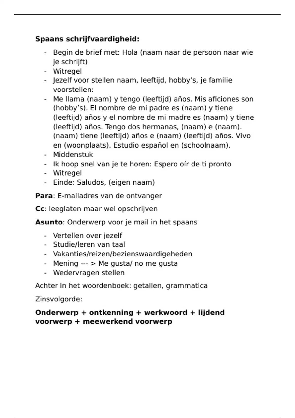 Handige opbouw voor het schrijven van een e-mail in het Spaans, handige tips en zinsopbouw in het Spaans. Super handig voor leerlingen die een schrijfvaardigheid toets hebben of willen oefenen om een echte brief te schrijven in het Spaans.