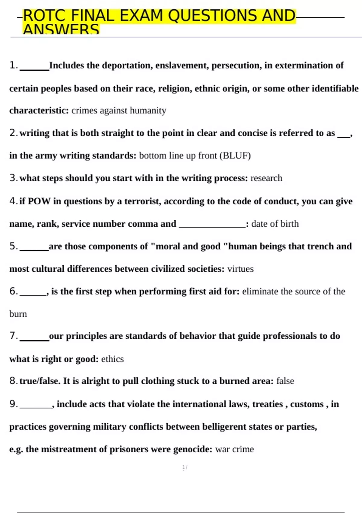 ROTC FINAL EXAM QUESTIONS AND ANSWERS 1. Includes the deportation, enslavement, persecution, in extermination of certain peoples based on their race, religion, ethnic origin, or some other identifiable characteristic: crimes against humanity 2. writing that is both straight to the point in clear and concise is referred to as , in the army writing standards: bottom line up front (BLUF) 3. what steps should you start with in the writing process: research