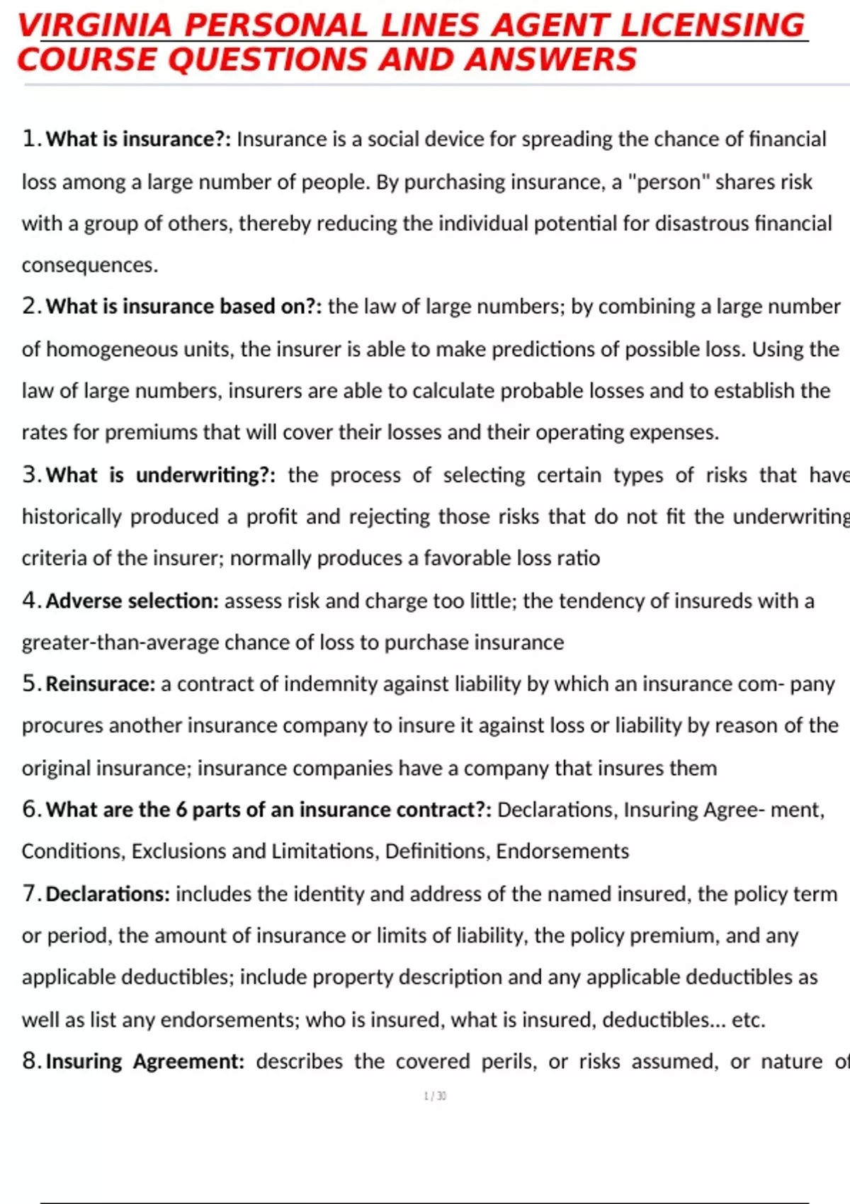 1.What is insurance?: Insurance is a social device for spreading the chance of financial