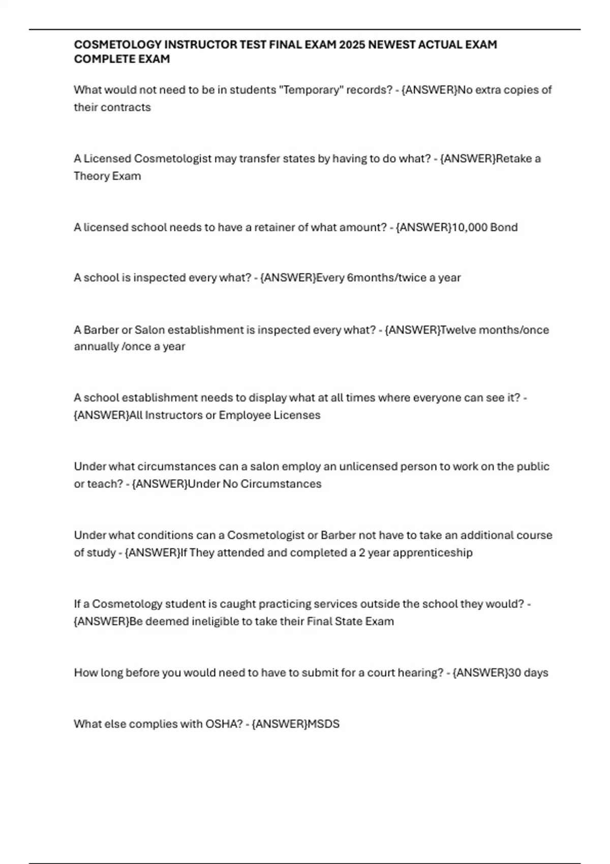 COSMETOLOGY INSTRUCTOR TEST FINAL EXAM 2025 NEWEST ACTUAL EXAM COMPLETE EXAM