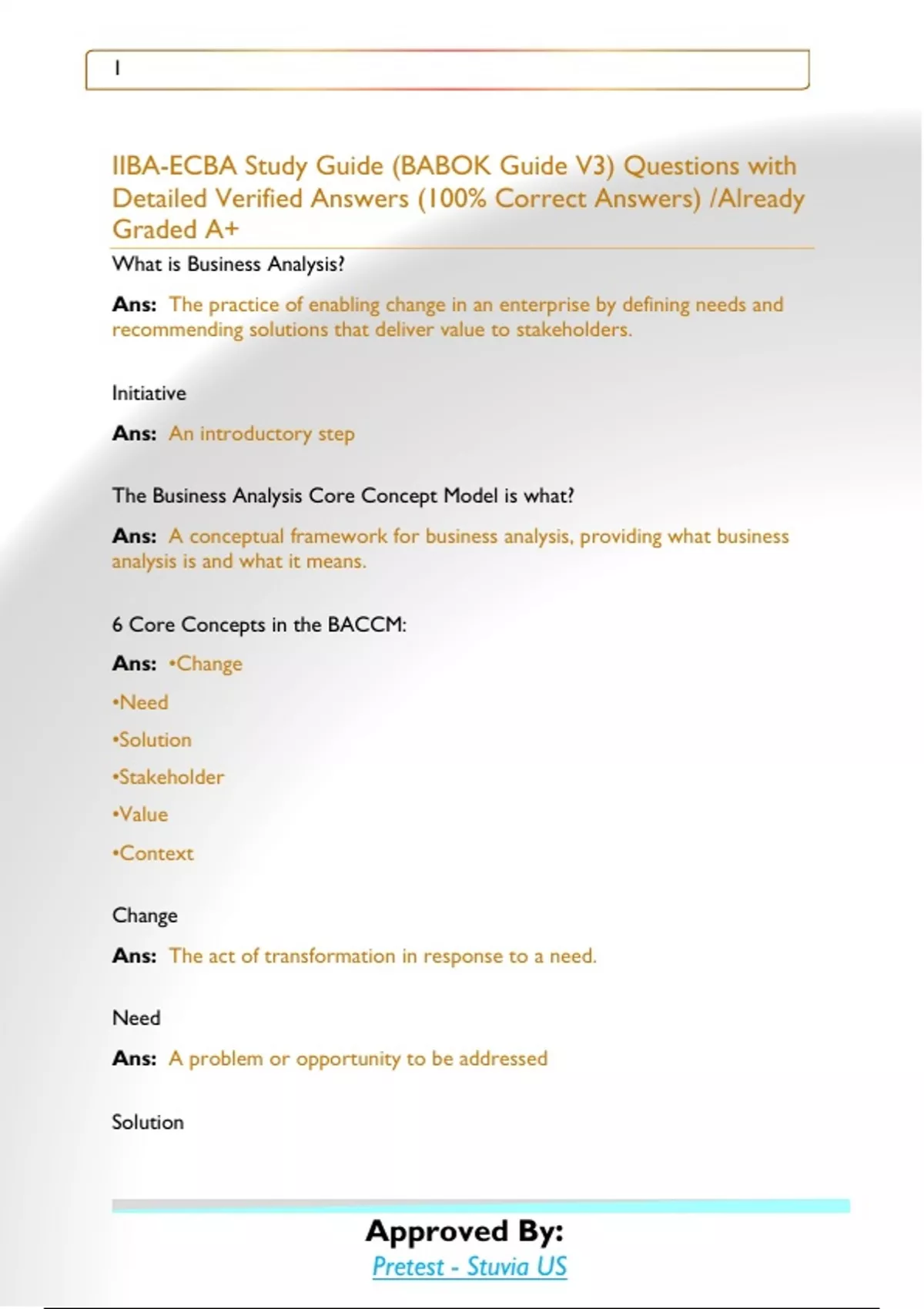 IIBA-ECBA Study Guide (BABOK Guide V3) Questions with Detailed Verified Answers (100% Correct Answers) /Already Graded A+ What is Business Analysis? Ans: The practice of enabling change in an enterprise by defining needs and recommending solutions that