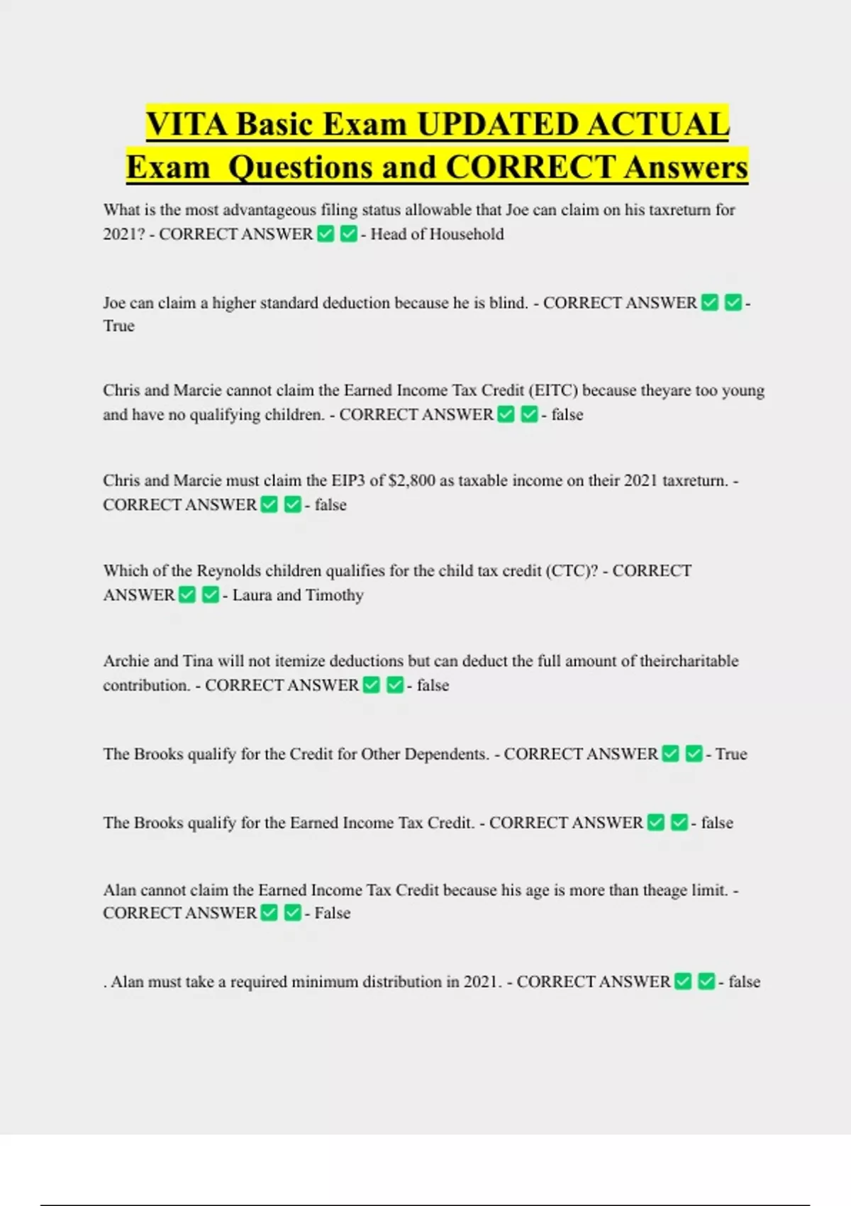 VITA Basic Exam UPDATED ACTUAL Exam Questions and CORRECT Answers What is the most advantageous filing status allowable that Joe can claim on his taxreturn for 2021? - CORRECT ANSWER - Head of Household Joe can claim a higher standard deduction because he is blind. - CORRECT ANSWER True - Chris and Marcie cannot claim the Earned Income Tax Credit (EITC) because theyare too young and have no qualifying children. - CORRECT ANSWER - false