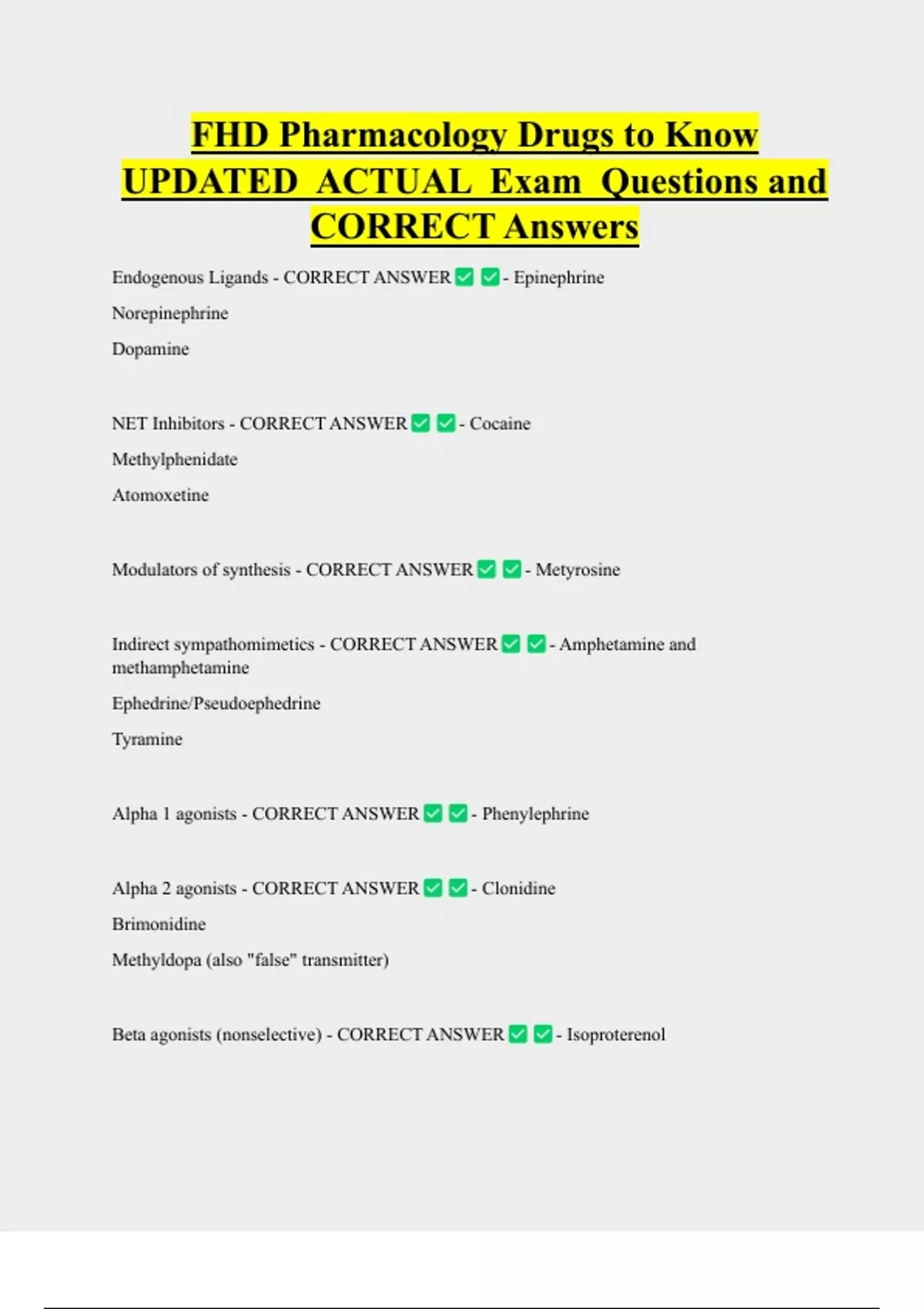FHD Pharmacology Drugs to Know UPDATED ACTUAL Exam Questions and CORRECT Answers Endogenous Ligands - CORRECT ANSWER Norepinephrine Dopamine NET Inhibitors - CORRECT ANSWER Methylphenidate Atomoxetine Modulators of synthesis - CORRECT ANSWER Indirect sympathomimetics - CORRECT ANSWER methamphetamine Ephedrine/Pseudoephedrine Tyramine Alpha 1 agonists - CORRECT ANSWER Alpha 2 agonists - CORRECT ANSWER Brimonidine Methyldopa (also "false" transmitter) - Epinephrine - Cocaine - Metyrosine