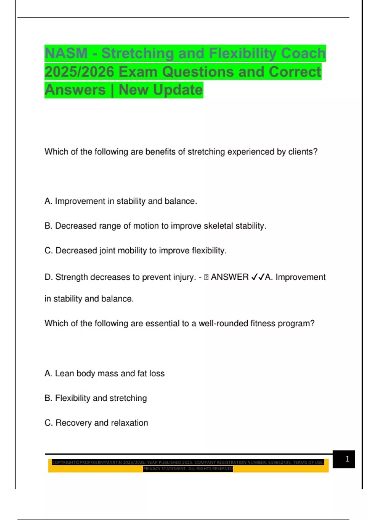 NASM - Stretching and Flexibility Coach 2025/2026 Exam Questions and Correct Answers | New Update
