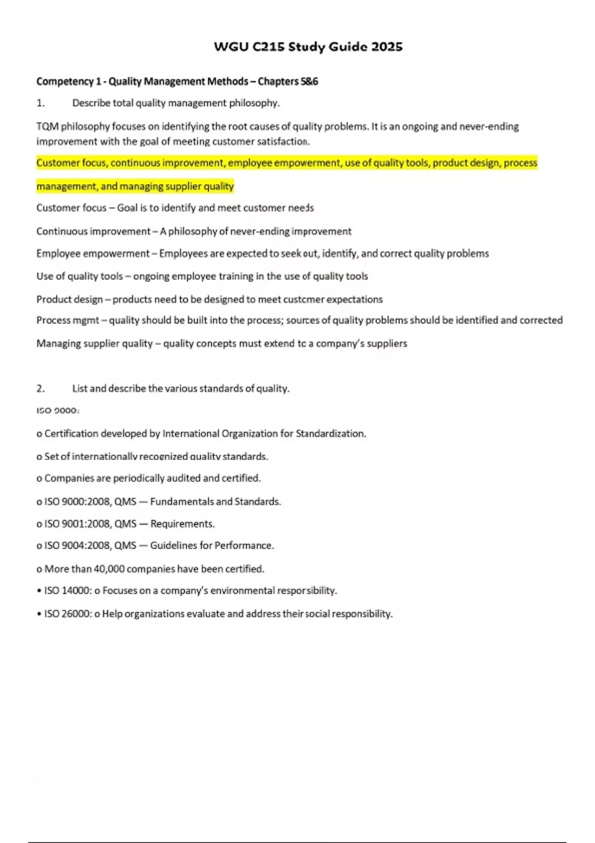 Competency 1 - Quality Management Methods – Chapters 5&6 1. Describe total quality management philosophy. TQM philosophy focuses on identifying the root causes of quality problems. It is an ongoing and never-ending improvement with the goal of meeting customer satisfaction. Customer focus, continuous improvement, employee empowerment, use of quality tools, product design, process management, and managing supplier quality Customer focus – Goal is to identify and meet customer needs Continuous improvement – A philosophy of never-ending improvement Employee empowerment – Employees are expected to seek out, identify, and correct quality problems Use of quality tools – ongoing employee training in the use of quality tools Product design – products need to be designed to meet customer expectations Process mgmt – quality should be built into the process; sources of quality problems should be identified and corrected Managing supplier quality – quality concepts must extend to a company’s suppliers 2. List and describe the various standards of quality. ISO 9000: o Certification developed by International Organization for Standardization. o Set of internationally recognized quality standards. o Companies are periodically audited and certified. o ISO 9000:2008, QMS — Fundamentals and Standards. o ISO 9001:2008, QMS — Requirements. o ISO 9004:2008, QMS — Guidelines for Performance. o More than 40,000 companies have been certified. • ISO 14000: o Focuses on a company’s environmental responsibility. • ISO 26000: o Help organizations evaluate and address their social responsibility. 3. List the quality gurus and their contributions to the TQM concept. 4. Identify and discuss the seven quality control tools management use to analyze quality problems. Cause & Effect Diagram - Often called fishbone diagram. Used to identify potential causes of quality problems. Used by quality control teams, explored through brainstorming. Flowcharts – schematic diagram used to document the detailed steps in a process. Sequence of steps involved in an operations/process. Ops mgr can identify bottlenecks Checklist – simple data check-off sheets, alist of common defects and the # of observed occurrences of these defects. Designed to identify type of quality problems at each workstations/per shift/machine/operator. (ie type-broken zipper, ripped material, missing button, faded color) Control charts – used to evaluate whether a process is operating within set expectations. The UCL and LCL are calculated limits used to show when a process is in or out of control – ie weight, width, or volume. UCL – Upper control limit | LCL – Lower control limit Scatter diagram – graphs that show how 2 variables are related to one another. Useful in detecting the amount of correlation, or the degree of linear relationship. Pareto Analysis – used to identify quality problems based on their degree of importance. 80-20 rule. Principle is that quality problems are the result of only a few causes – 80% of problems are caused by 20% of causes. Histograms – a chart that shows the frequency distribution of observed values of a variable – ie service time at a bank drive-up window. Displays whether the distribution is symmetrical(normal) or skewed. 5. List and describe the costs of quality. Quality control costs (to achieve high quality)– Prevention costs and Appraisal costs Quality failure costs (high costs associated with poor quality) – Internal and External failure costs 6. Explain the concept of the Plan-Do-Study-Act Cycle. PDSA is part of Continuous improvement - A philosophy of never-ending improvement, e.g., Kaizen. Plan o Evaluate current process. o Document current procedures, collect data, and identify problems. o Develop an improvement plan, performance objectives. • Do o Implement the plan — trial basis. • Study o Collect data and evaluate against objectives. • Act o Communicate the results from the trial. o If successful, implement new process. 7. Define statistical quality control (SQC). the term used to describe the set of statistical tools used by quality professionals to evaluate organizational quality. Three categories for SQC 1. Descriptive statistics are used to describe quality characteristics and relationships. • Included are statistics such as the mean, the standard deviation, the range, and a measure of the distribution of data. 2. Statistical process control (SPC) involves inspecting a random sample of the output from a process and deciding if it falls within range and whether the process is functioning properly. 3. Acceptance sampling is used to randomly inspect a batch of goods to determine acceptance/rejection. 8. Explain the two causes of variation (common and assignable). Variation can be categorized as common or assignable. o Common, or random, causes of variation • Random causes that we cannot identify. • Unavoidable and due to slight differences in processing. o Assignable causes of variation • Causes that can be identified and corrected. • Examples: poor employee training, worn tool, machine needing repair. 9. Explain the concepts of process capability and process capability index. Process capability is the ability of the production process to meet or exceed preset specifications. It is measured by the process capability index Cp , which is computed as the ratio of the specification width to the width of the process variable 10. Describe the concept of Six sigma and its five-step plan. Six Sigma: A high level of quality associated with approximately 3.4 defective parts per million. o Before design, marketing ensures that product characteristics are what customers want. o Operations ensures that product design characteristics can be met by controlling materials and processes to 6σ levels. o Other functions like finance and accounting use 6σ concepts to control all of their processes.