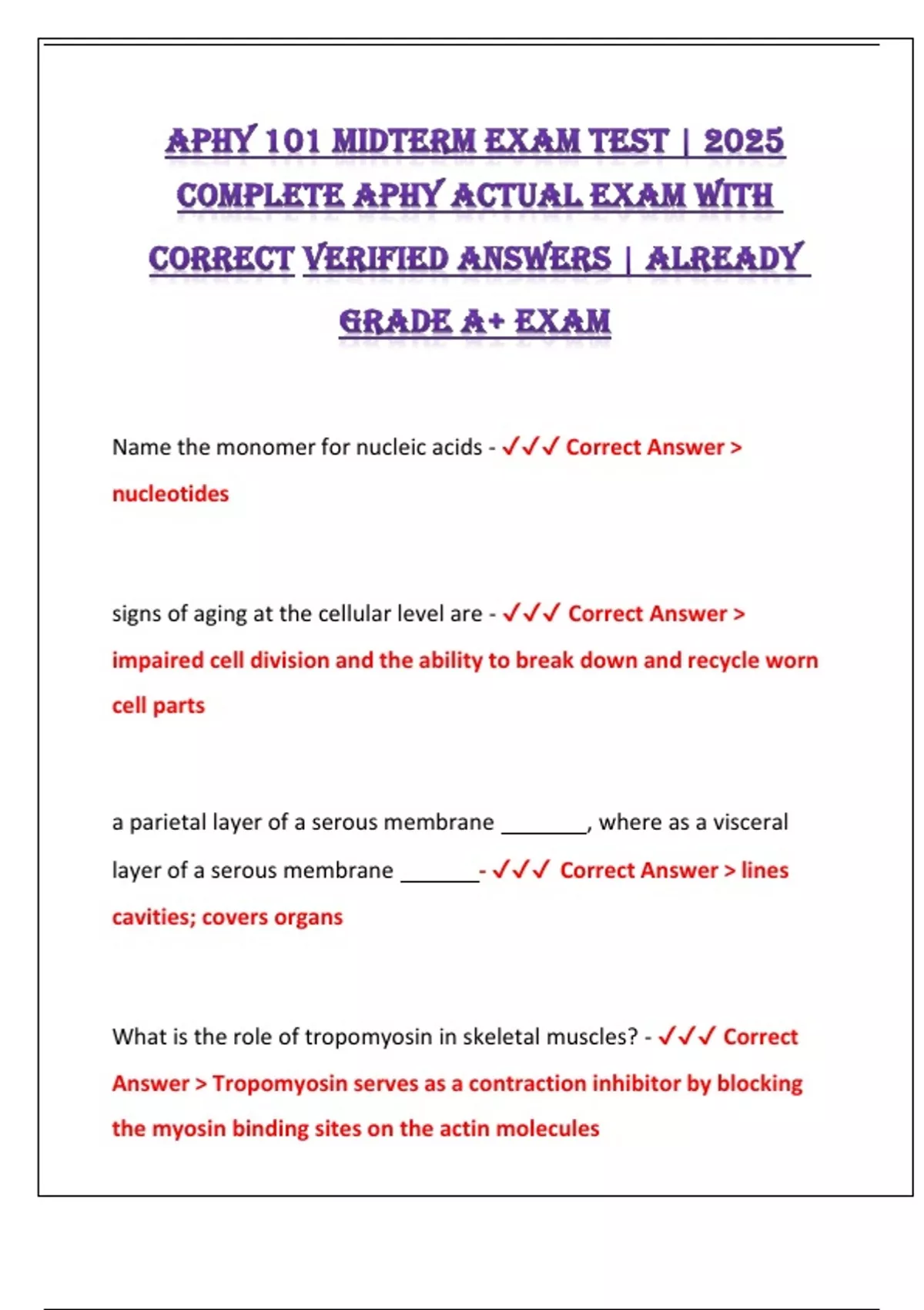 APHY 101 MIDTERM EXAM TEST | 2025 COMPLETE APHY ACTUAL EXAM WITH CORRECT VERIFIED ANSWERS | ALREADY GRADE A+ EXAM Name the monomer for nucleic acids - Correct Answer > nucleotides signs of aging at the cellular level are - Correct Answer > impaired cell division and the ability to break down and recycle worn cell parts a parietal layer of a serous membrane , where as a visceral layer of a serous membrane - Correct Answer > lines cavities; covers organs What is the role of tropomyosin in skeletal muscles? - Correct Answer > Tropomyosin serves as a contraction inhibitor by blocking the myosin binding sites on the actin molecules