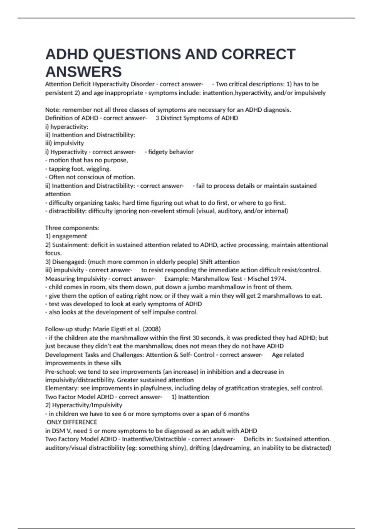 ADHD QUESTIONS AND CORRECT ANSWERS