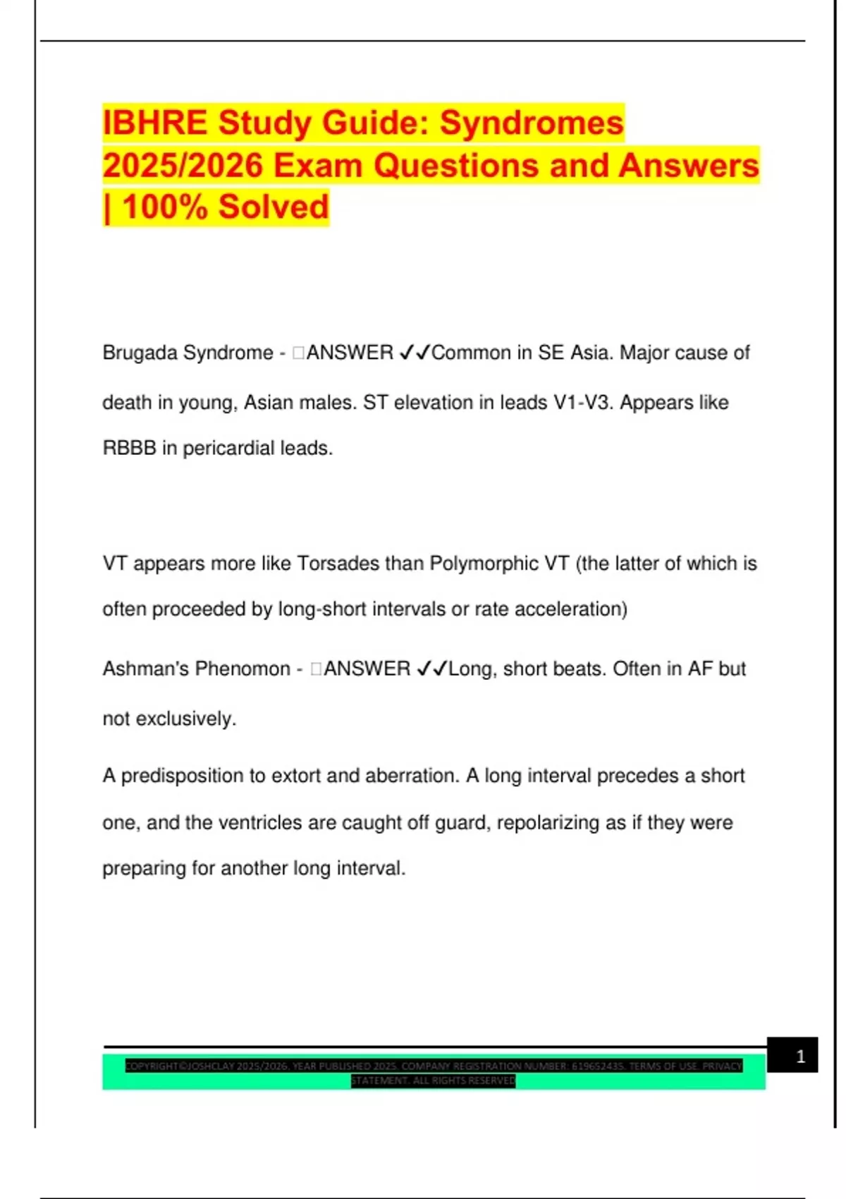 IBHRE Study Guide: Syndromes 2025/2026 Exam Questions and Answers | 100% Solved Brugada Syndrome -