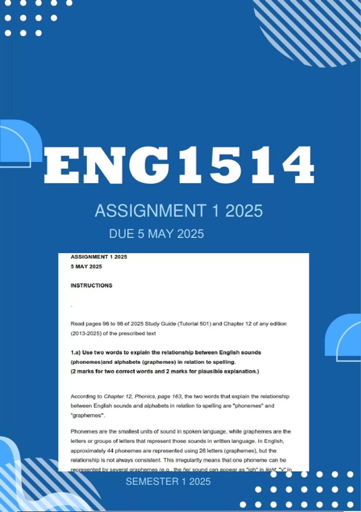 ENG1514 ASSIGNMENT 1 2025 5 MAY 2025 INSTRUCTIONS . Read pages 96 to 98 of 2025 Study Guide (Tutorial 501) and Chapter 12 of any edition () of the prescribed text 1.a) Use two words to explain the relationship between English sounds (phonemes)and alphabets (graphemes) in relation to spelling. (2 marks for two correct words and 2 marks for plausible explanation.) According to Chapter 12, Phonics, page 163, the two words that explain the relationship between English sounds and alphabets in relation to spelling are "phonemes" and "graphemes". Phonemes are the smallest units of sound in spoken language, while graphemes are the letters or groups of letters that represent those sounds in written language. In English, approximately 44 phonemes are represented using 26 letters (graphemes), but the relationship is not always consistent. This irregularity means that one phoneme can be represented by several graphemes (e.g., the /ie/ sound can appear as "igh" in light, "y" in my, or "i-e" in like), and one grapheme can represent multiple phonemes depending on context (e.g., the letter "e" in remember). This complex relationship is central to phonics teaching and is key in helping learners decode and spell words effectively.