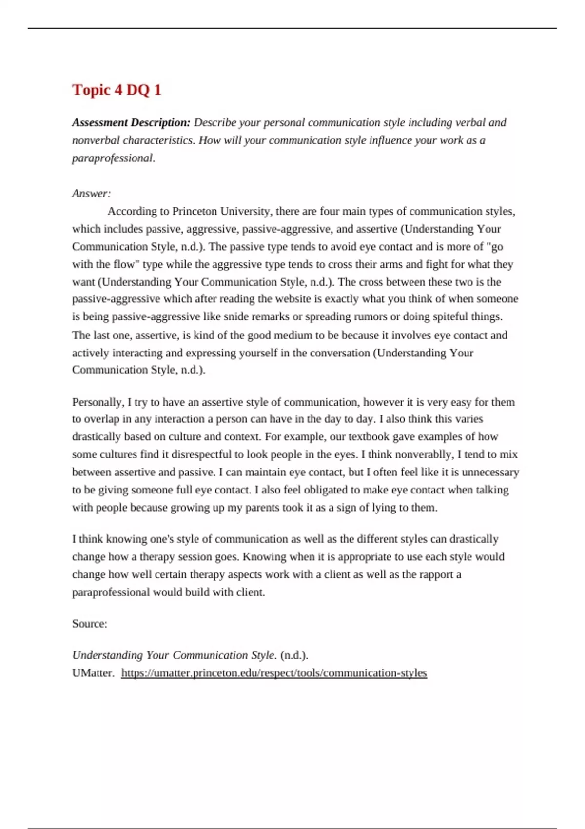 Assessment Description: Describe your personal communication style including verbal and