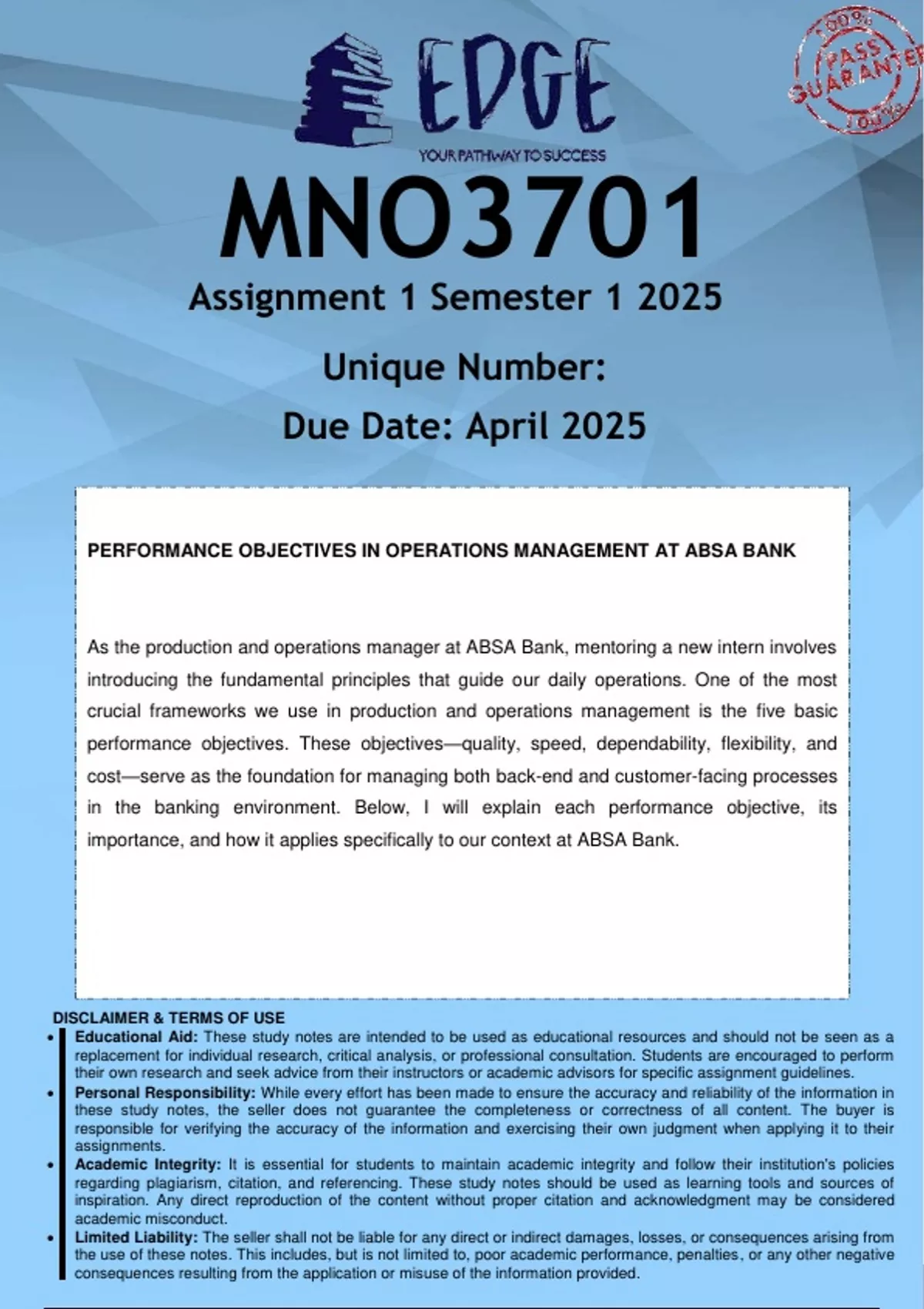 PERFORMANCE OBJECTIVES IN OPERATIONS MANAGEMENT AT ABSA