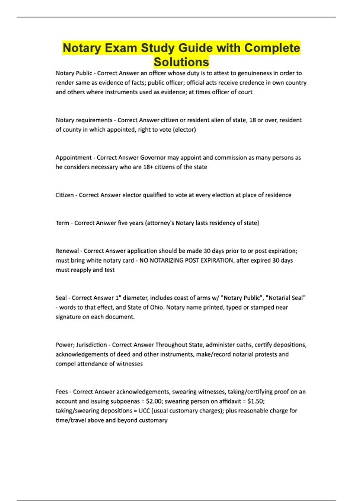 Notary Exam Study Guide with Complete Solutions