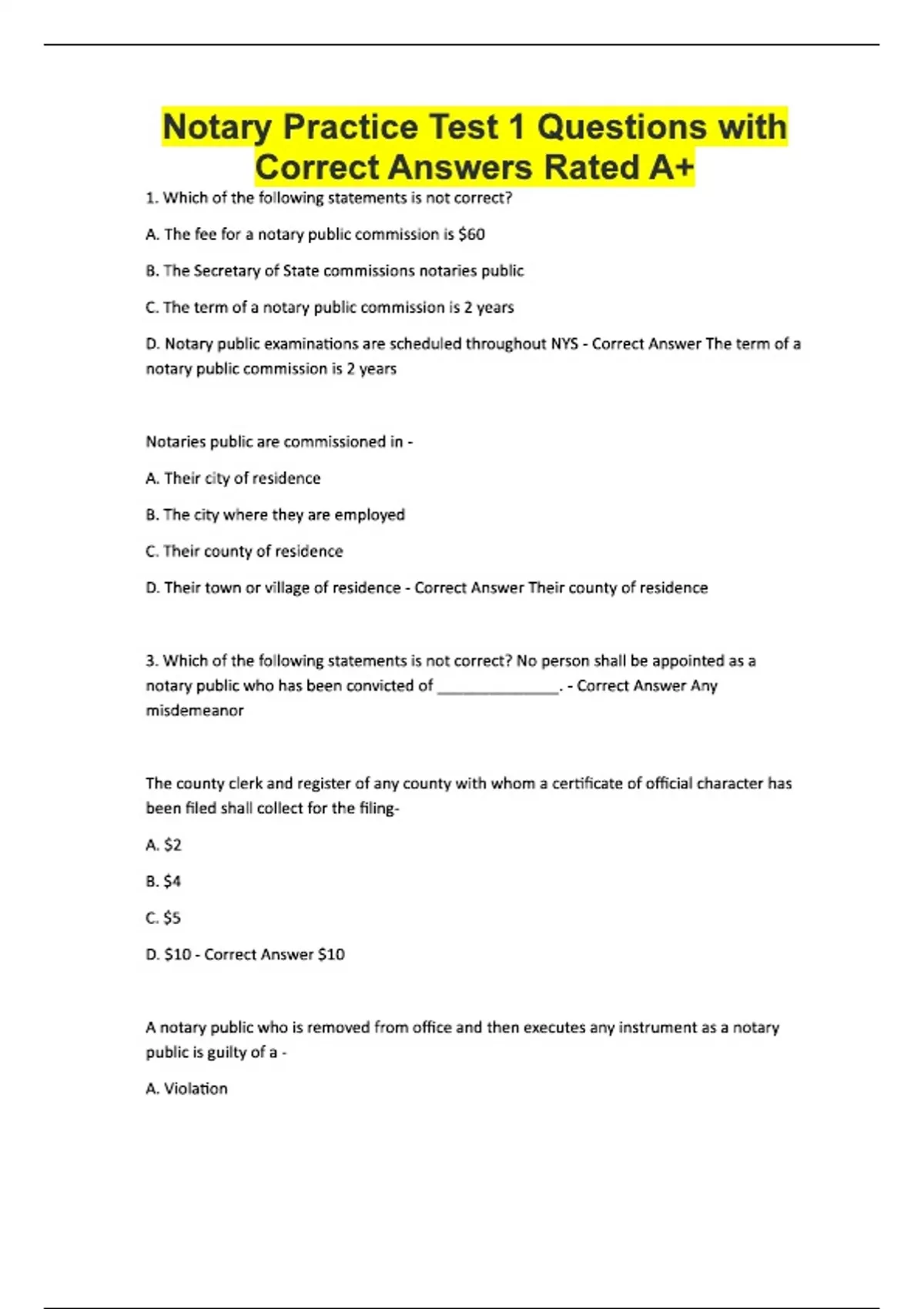 Notary Practice Test 1 Questions with Correct Answers Rated A+ 1. Which of the following statements is not correct? A. The fee for a notary public commission is $60 B. The Secretary of State commissions notaries public C. The term of a notary public commission is 2 years D. Notary public examinations are scheduled throughout NYS - Correct Answer The term of a notary public commission is 2 years Notaries public are commissioned in - A. Their city of residence B. The city where they are employed C. Their county of residence D. Their town or village of residence - Correct Answer Their county of residence 3. Which of the following statements is not correct? No person shall be appointed as a notary public who has been convicted of ______________. - Correct Answer Any misdemeanor The county clerk and register of any county with whom a certificate of official character has been filed shall collect for the filing- A. $2 B. $4 C. $5 D. $10 - Correct Answer $10 A notary public who is removed from office and then executes any instrument as a notary public is guilty of a - A. Violation B. Petty offense