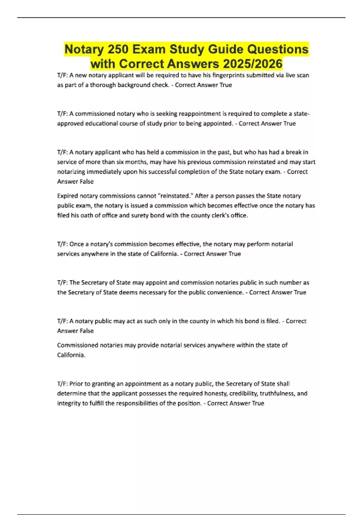 Notary 250 Exam Study Guide Questions with Correct Answers 2025/2026