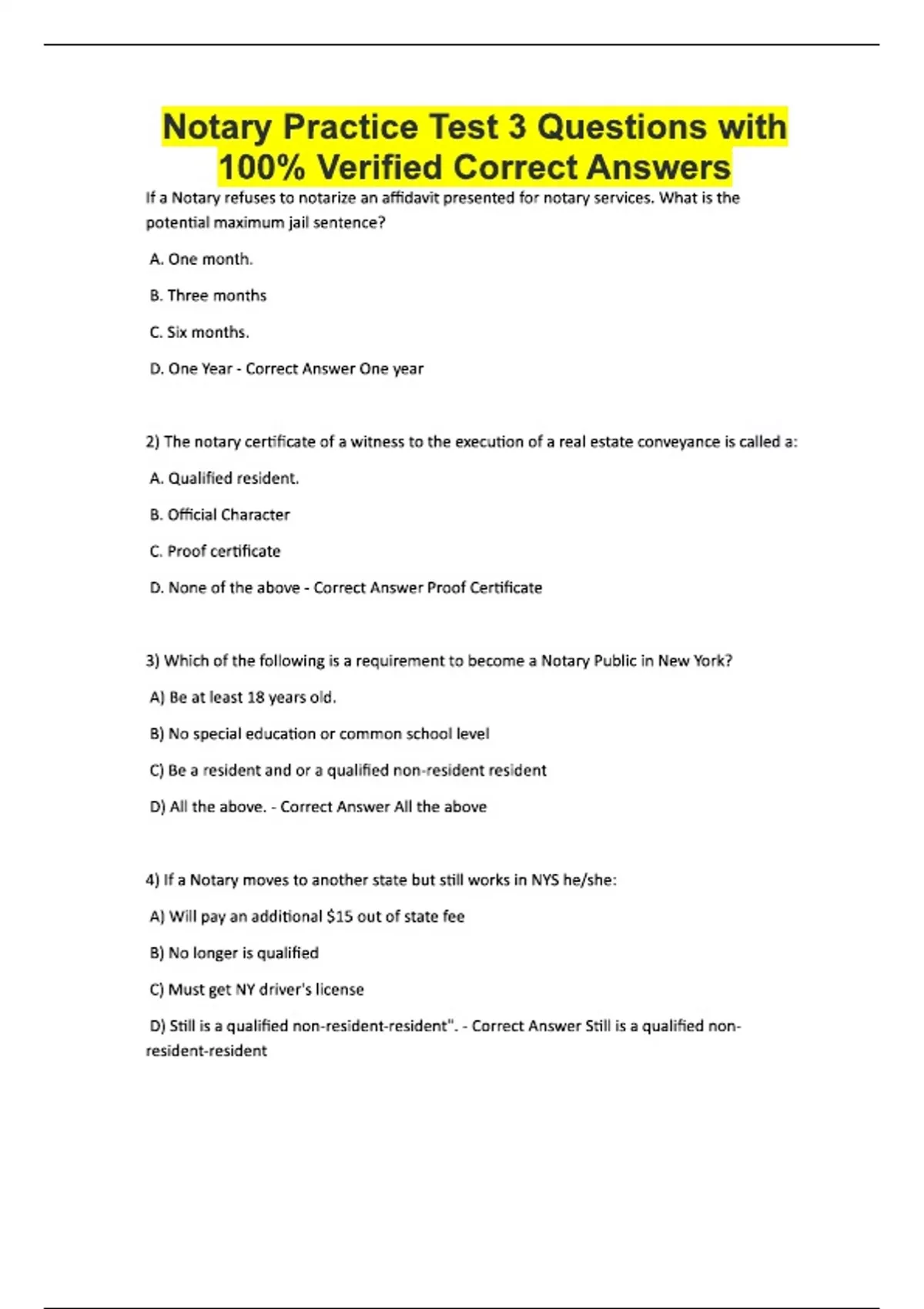 Notary Practice Test 3 Questions with 100% Verified Correct Answers If a Notary refuses to notarize an affidavit presented for notary services. What is the potential maximum jail sentence? A. One month. B. Three months C. Six months. D. One Year - Correct Answer One year 2) The notary certificate of a witness to the execution of a real estate conveyance is called a: A. Qualified resident. B. Official Character C. Proof certificate D. None of the above - Correct Answer Proof Certificate 3) Which of the following is a requirement to become a Notary Public in New York? A) Be at least 18 years old. B) No special education or common school level C) Be a resident and or a qualified non-resident resident D) All the above. - Correct Answer All the above 4) If a Notary moves to another state but still works in NYS he/she: A) Will pay an additional $15 out of state fee B) No longer is qualified C) Must get NY driver's license D) Still is a qualified non-resident-resident". - Correct Answer Still is a qualified non-resident-resident 5) Which of the following are errors