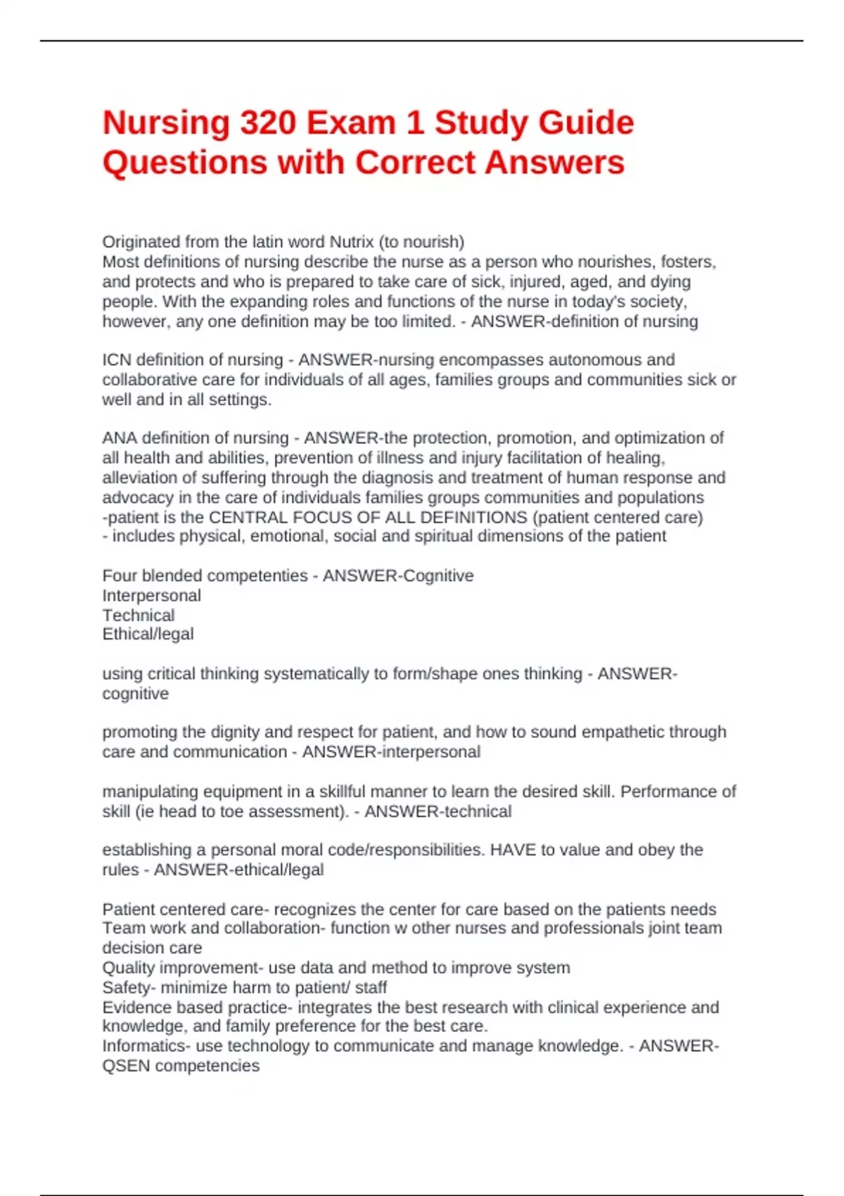 Nursing 320 Exam 1 Study Guide Questions with Correct Answers