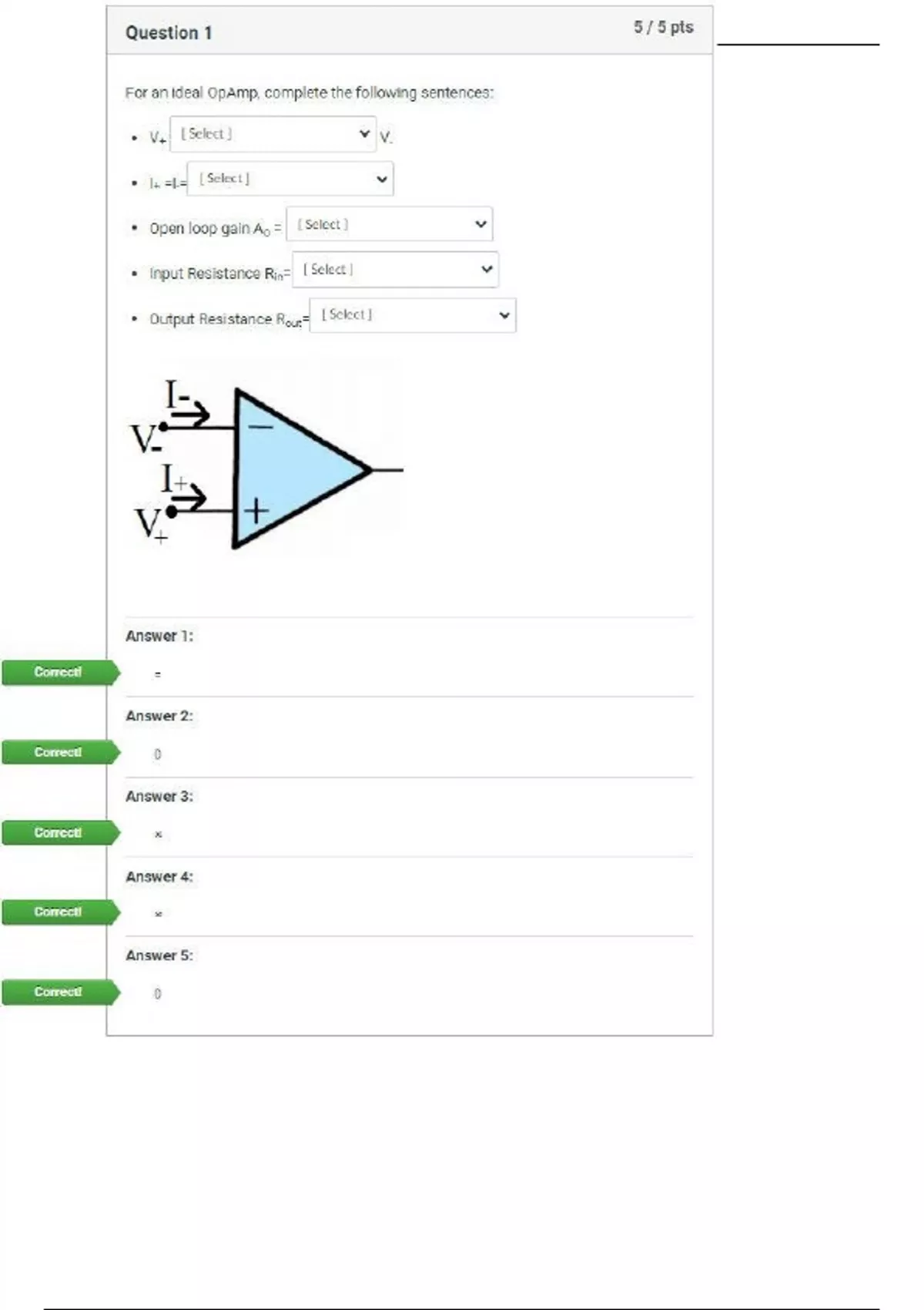 For an ideal OpAmp, complete the following sentences: