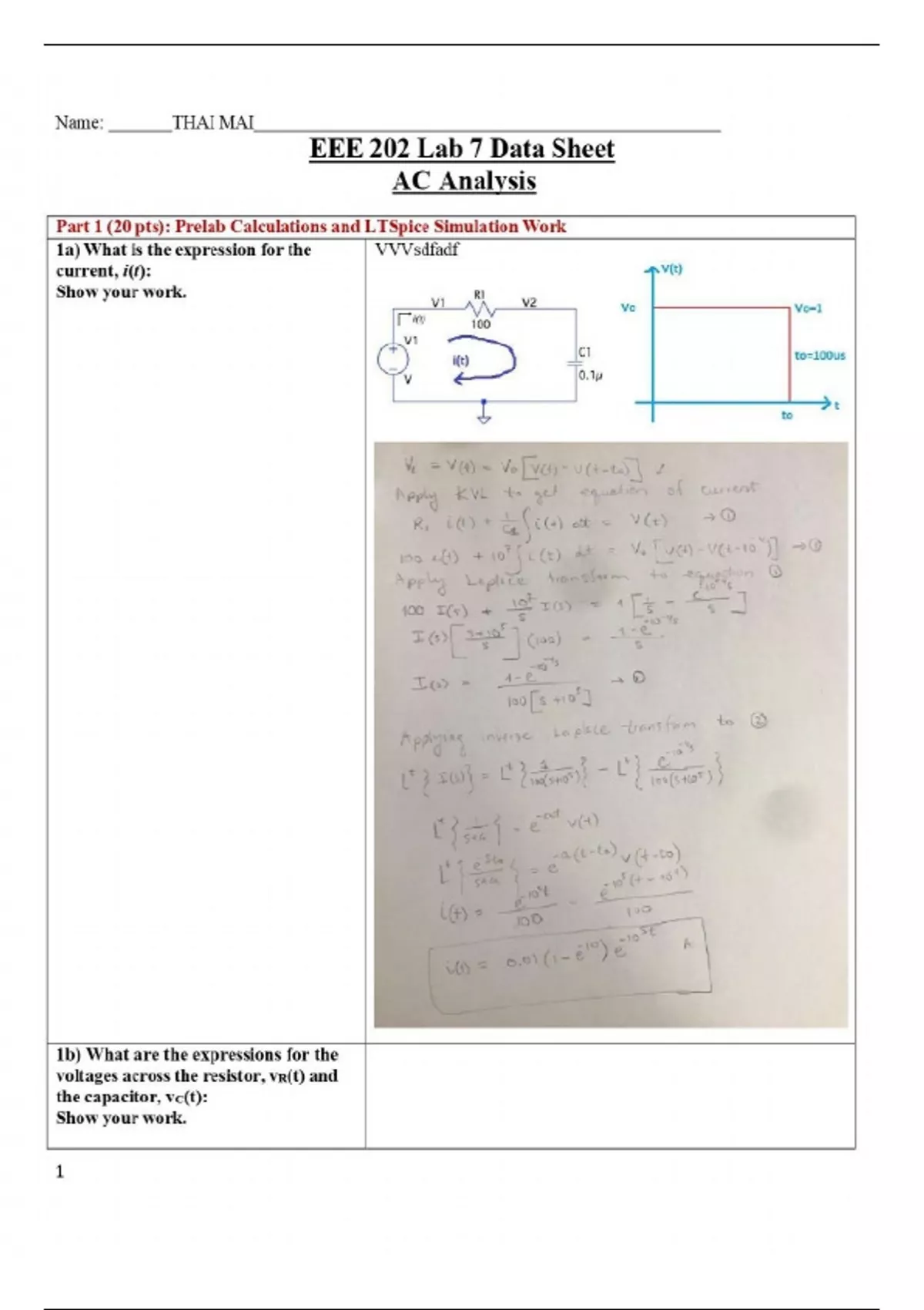EEE 202 Lab 7 Data Sheet AC Analysis|2025 Update with complete solution.
