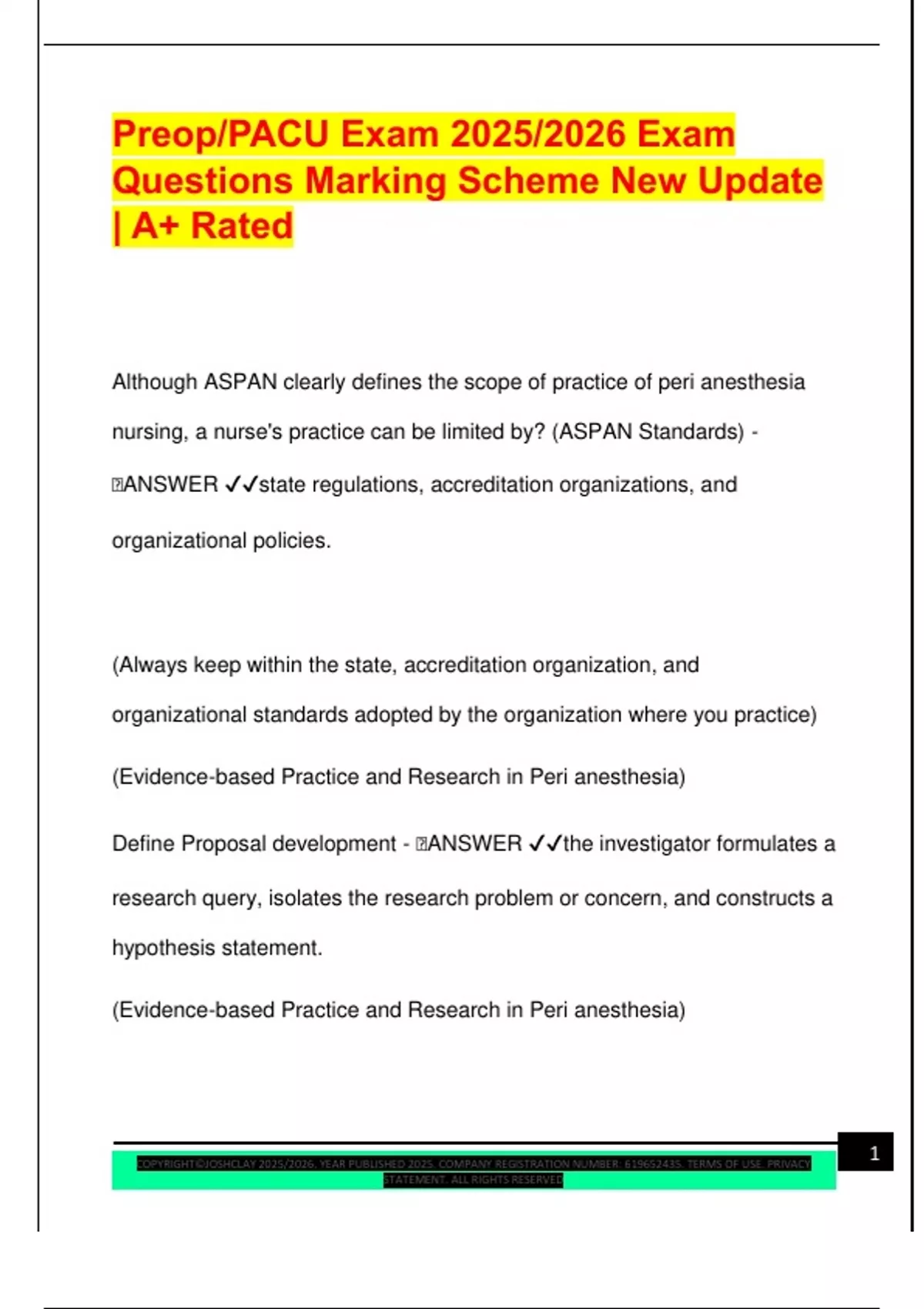Preop/PACU Exam 2025/2026 Exam Questions Marking Scheme New Update | A+ Rated Although ASPAN clearly defines the scope of practice of peri anesthesia nursing, a nurse's practice can be limited by? (ASPAN Standards) - � �ANSWER state regulations, accreditation organizations, and organizational policies. (Always keep within the state, accreditation organization, and organizational standards adopted by the organization where you practice) (Evidence-based Practice and Research in Peri anesthesia) Define Proposal development -