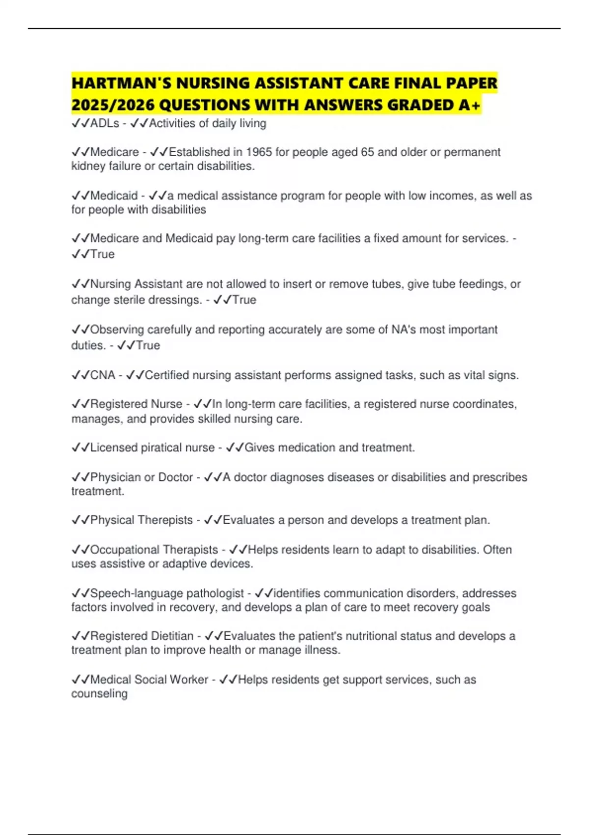 ✔✔Nursing Assistant are not allowed to insert or remove tubes, give tube feedings, or